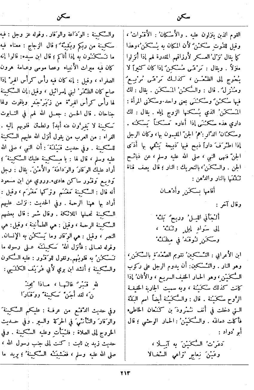 الْقَوْمِ الَّذِينَ يَنْزِلُونَ عَلَيْهِ. والأَسْكانُ: الأَقْواتُ، وَقِيلَ للقُوتِ سُكْنٌ لأَن الْمَكَانَ بِهِ يُسْكَنُ، وَهَذَا كَمَا يُقَالُ نُزْلُ الْعَسْكَرِ لأَرزاقهم الْمُقَدِّرَةِ لَهُمْ إِذَا أُنزِلوا مَنْزِلًا. وَيُقَالُ: مَرْعًى مُسْكِنٌ إِذَا كَانَ كَثِيرًا لَا يُحْوج إِلَى الظَّعْن، كَذَلِكَ مَرْعًى مُرْبِعٌ ومُنْزِلٌ. قَالَ: والسُّكْنُ المَسْكَن. يُقَالُ: لَكَ فِيهَا سُكْنٌ وسُكْنَى بِمَعْنًى وَاحِدٍ. وسُكْنى المرأَة: المَسْكَنُ الَّذِي يُسْكنها الزَّوْجُ إِيَّاهُ. يُقَالُ: لَكَ دَارِي هَذِهِ سُكْنَى إِذَا أَعاره مَسْكناً يَسْكُنه. وسُكّانُ الدَّارِ: هُمُ الْجِنُّ الْمُقِيمُونَ بِهَا، وَكَانَ الرَّجُلُ إِذَا اطَّرَفَ دَارًا ذَبَحَ فِيهَا ذَبيحة يَتَّقي بِهَا أَذَى الْجِنِّ فَنَهَى النَّبِيُّ، صَلَّى اللَّهُ عَلَيْهِ وَسَلَّمَ، عَنْ ذَبَائِحِ الْجِنِّ. والسَّكَنُ، بِالتَّحْرِيكِ: النَّارُ؛ قَالَ يَصِفُ قَنَاةً ثَقَّفَها بِالنَّارِ والدُّهن: