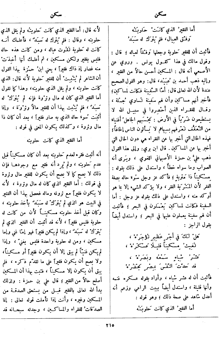 ؛ فأَخبر أَنهم مَسَاكِينُ وأَن لَهُمْ سَفينة تُساوي جُمْلة، وَقَالَ لِلْفُقَراءِ الَّذِينَ أُحْصِرُوا فِي سَبِيلِ اللَّهِ لَا يَسْتَطِيعُونَ ضَرْباً فِي الْأَرْضِ: يَحْسَبُهُمُ الْجاهِلُ أَغْنِياءَ مِنَ التَّعَفُّفِ تَعْرِفُهُمْ بِسِيماهُمْ لا يَسْئَلُونَ النَّاسَ إِلْحافاً؛ فَهَذِهِ الْحَالُ الَّتِي أَخبر بِهَا عَنِ الْفُقَرَاءِ هِيَ دُونَ الْحَالِ الَّتِي أَخبر بِهَا عَنِ الْمَسَاكِينِ. قَالَ ابْنُ بَرِّيٍّ: وإِلى هَذَا الْقَوْلِ ذَهَبَ عليُّ بْنُ حَمْزَةَ الأَصبهاني اللُّغَوِيُّ، ويَرى أَنه الصَّوَابُ وَمَا سِوَاهُ خطأٌ، وَاسْتَدَلَّ عَلَى ذَلِكَ بِقَوْلِهِ: مِسْكِيناً ذَا مَتْرَبَةٍ