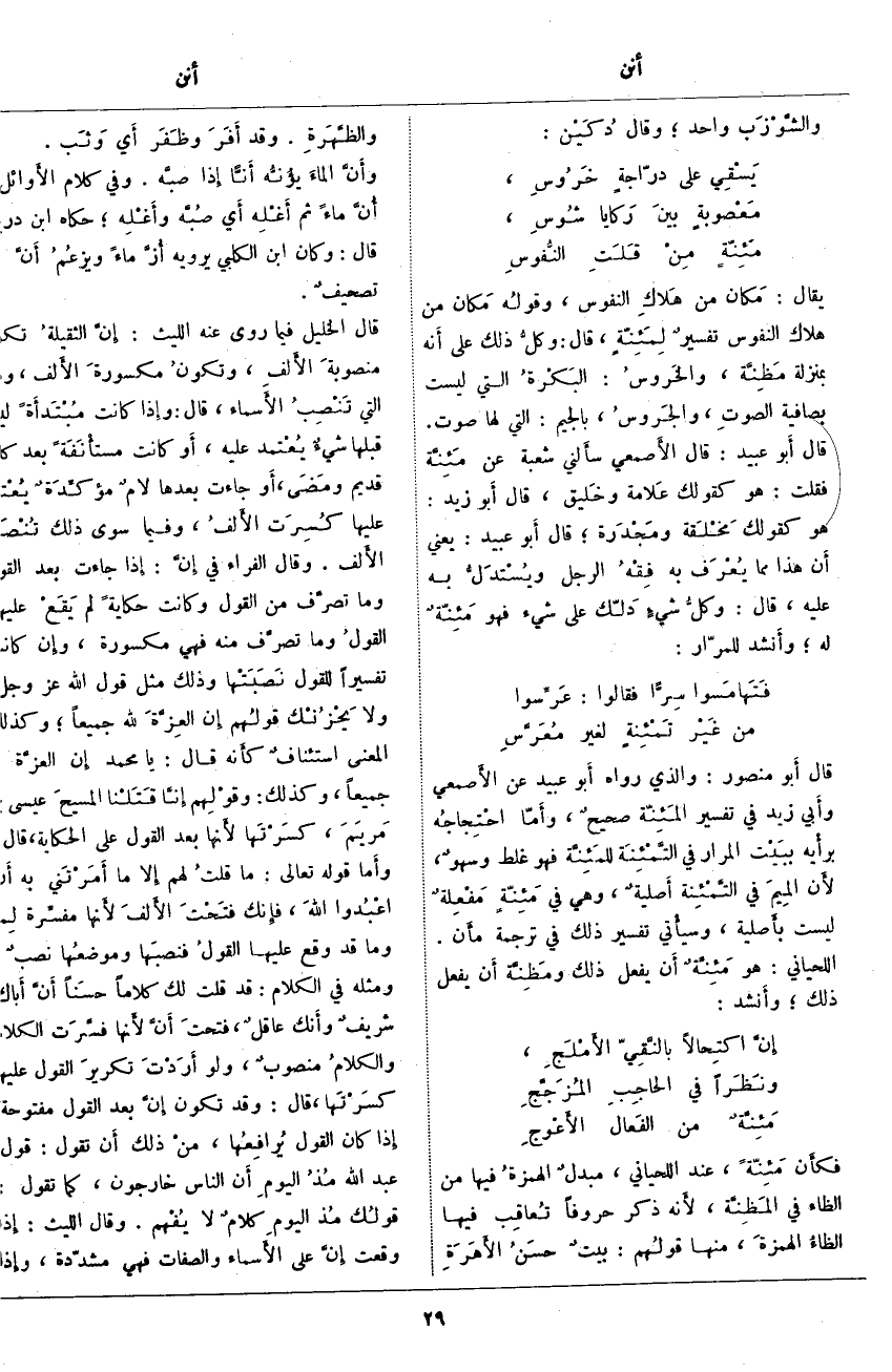 فكأَن مَئِنّةً، عِنْدَ اللِّحْيَانِيِّ، مبدلٌ الهمزةُ فِيهَا مِنَ الظَّاءِ فِي المَظِنَّة، لأَنه ذَكَرَ حُرُوفًا تُعاقِب فِيهَا الظاءُ الهمزةَ، مِنْهَا قولُهم: بيتٌ حسَنُ الأَهَرَةِ والظَّهَرةِ. وَقَدْ أَفَرَ وظَفَر أَي وثَب. وأَنَّ الماءَ يؤُنُّه أَنًّا إِذَا صبَّه. وَفِي كَلَامِ الأَوائل: أُنَّ مَاءً ثُمَّ أَغْلِه أَي صُبَّه وأَغْلِه؛ حَكَاهُ ابْنُ دُرَيْدٍ، قَالَ: وَكَانَ ابْنُ الْكَلْبِيِّ يَرْوِيهِ أُزّ مَاءً ويزعُمُ أَنَّ أُنَّ تصحيفٌ. قَالَ الْخَلِيلُ فِيمَا رَوَى عَنْهُ اللَّيْثُ: إنَّ الثقيلةُ تَكُونُ منصوبةَ الأَلفِ، وتكونُ مكسورةَ الأَلف، وَهِيَ الَّتِي تَنْصِبُ الأَسماء، قَالَ: وَإِذَا كَانَتْ مُبتَدأَةً لَيْسَ قَبْلَهَا شيءٌ يُعْتمد عَلَيْهِ، أَو كَانَتْ مستأْنَفَةً بَعْدَ كَلَامٍ قَدِيمٍ ومَضَى، أَو جَاءَتْ بَعْدَهَا لامٌ مؤكِّدَةٌ يُعْتمد عَلَيْهَا كُسِرَتْ الأَلفُ، وَفِيمَا سِوَى ذَلِكَ تُنْصَب الأَلف. وَقَالَ الْفَرَّاءُ فِي إنَّ: إِذَا جَاءَتْ بَعْدَ الْقَوْلِ وَمَا تَصَرَّفَ مِنَ الْقَوْلِ وَكَانَتْ حِكَايَةً لَمْ يَقَعْ عَلَيْهَا القولُ وَمَا تصرَّف مِنْهُ فَهِيَ مَكْسُورَةٌ، وَإِنْ كَانَتْ تَفْسِيرًا لِلْقَوْلِ نَصَبَتْها وَذَلِكَ مِثْلَ قَوْلَ اللَّهِ عَزَّ وَجَلَّ: وَلا يَحْزُنْكَ قَوْلُهُمْ إِنَّ الْعِزَّةَ لِلَّهِ جَمِيعاً