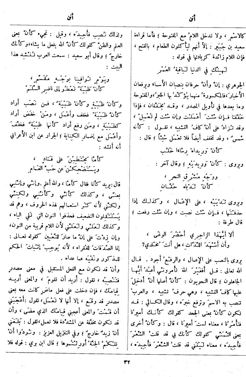 يُرْوَى بِالنَّصْبِ عَلَى الإِعمال، والرفْعُ أَجود. قَالَ اللَّهُ تَعَالَى: قُلْ أَفَغَيْرَ اللَّهِ تَأْمُرُونِّي أَعْبُدُ أَيُّهَا الْجاهِلُونَ، قَالَ النَّحْوِيُّونَ: كأَنَّ أَصلُها أَنَّ أُدخِلَ عَلَيْهَا كافُ التَّشْبِيهِ، وَهِيَ حرفُ تَشْبِيهٍ، والعربُ تَنْصِبُ بِهِ الاسمَ وَتَرْفَعُ خبرَه، وقال الْكِسَائِيُّ: قَدْ تَكُونُ كأَنَّ بِمَعْنَى الْجَحْدِ كَقَوْلِكَ كأَنك أميرُنا فتأْمُرُنا، مَعْنَاهُ لستَ أَميرَنا، قَالَ: وكأَنَّ أُخرى بِمَعْنَى التَّمَنِّي كَقَوْلِكَ كأَنك بِي قَدْ قلتُ الشِّعْرَ فأُجِيدَه، مَعْنَاهُ لَيْتَني قَدْ قلتُ الشِّعْرَ فأُجيدَه، وَلِذَلِكَ نُصِب فأُجيدَه، وَقِيلَ: تَجِيءُ كأَنَّ بِمَعْنَى الْعِلْمِ والظنِّ كَقَوْلِكَ كأَنَّ اللَّهَ يَفْعَلُ مَا يَشَاءُ، وكأَنك خارجٌ؛ وَقَالَ أَبو سَعِيدٍ: سَمِعْتُ الْعَرَبَ تُنشِد هَذَا الْبَيْتَ: