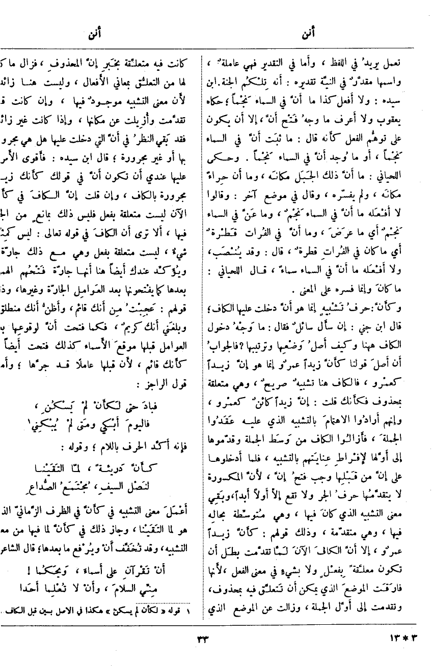 تَعْمَلُ يريدُ فِي اللَّفْظِ، وأَما فِي التَّقْدِيرِ فَهِيَ عاملةٌ، وَاسْمُهَا مقدَّرٌ فِي النيَّة تَقْدِيرُهُ: أَنه تِلْكُمْ الْجَنَّةُ. ابْنُ سِيدَهْ: وَلَا أَفعل كَذَا مَا أَنَّ فِي السَّمَاءِ نجْماً؛ حَكَاهُ يَعْقُوبُ وَلَا أَعرف مَا وجهُ فتْح أَنَّ، إِلَّا أَن يَكُونَ عَلَى توهُّم الْفِعْلِ كأَنه قَالَ: مَا ثَبَتَ أَنَّ فِي السَّمَاءِ نجْماً، أَو مَا وُجد أَنَّ فِي السَّمَاءِ نجْماً. وَحَكَى اللِّحْيَانِيُّ: مَا أَنَّ ذَلِكَ الجَبَل مكانَه، وَمَا أَنَّ حِراءً مكانَه، وَلَمْ يُفَسِّرْهُ وَقَالَ فِي مَوْضِعٍ آخَرَ: وَقَالُوا لَا أَفْعَله مَا أَنَّ فِي السَّمَاءِ نجْمٌ، وَمَا عَنَّ فِي السَّمَاءِ نجْمٌ أَي مَا عَرَضَ، وَمَا أَنَّ فِي الفُرات قَطْرةٌ أَي مَا كَانَ فِي الفُراتِ قطرةٌ، قَالَ: وَقَدْ يُنْصَب، وَلَا أَفْعَله مَا أَنَّ فِي السَّمَاءِ سَمَاءً، قَالَ اللِّحْيَانِيُّ: مَا كانَ وَإِنَّمَا فَسَّرَهُ عَلَى الْمَعْنَى. وكأَنَّ: حرفُ تشْبيهٍ إِنَّمَا هُوَ أَنَّ دَخَلَتْ عَلَيْهَا الْكَافُ؛ قَالَ ابْنُ جِنِّي: إِنْ سأَل سائلٌ فَقَالَ: مَا وَجْهُ دُخُولِ الْكَافِ هَاهُنَا وَكَيْفَ أَصلُ وضْعِها وَتَرْتِيبِهَا؟ فالجوابُ أَن أَصلَ قَوْلِنَا كأَنَّ زَيْدًا عمرٌو إِنَّمَا هُوَ إنَّ زَيْدًا كعمْرو، فَالْكَافُ هُنَا تشبيهٌ صريحٌ، وَهِيَ مُتَعَلِّقَةٌ بِمَحْذُوفٍ فكأَنك قُلْتَ: إنَّ زَيْدًا كائنٌ كعمْرو، وَإِنَّهُمْ أَرادُوا الاهتمامَ بِالتَّشْبِيهِ الَّذِي عَلَيْهِ عقَدُوا الجملةَ، فأَزالُوا الْكَافَ مِنْ وسَط الْجُمْلَةِ وَقَدَّمُوهَا إِلَى أَوَّلها لإِفراطِ عنايَتهم بِالتَّشْبِيهِ، فَلَمَّا أَدخلوها عَلَى إنَّ مِنْ قَبْلِها وَجَبَ فتحُ إنَّ، لأَنَّ الْمَكْسُورَةَ لَا يتقدَّمُها حرفُ الْجَرِّ وَلَا تَقَعُ إلَّا أَولًا أَبداً، وبقِي مَعْنَى التَّشْبِيهِ الَّذِي كانَ فِيهَا، وَهِيَ مُتوسِّطة بحالِه فِيهَا، وَهِيَ مُتَقَدِّمَةٌ، وَذَلِكَ قَوْلُهُمْ: كأَنَّ زَيْدًا عمرٌو، إِلَّا أَنَّ الكافَ الآنَ لمَّا تقدَّمت بطَل أَن تَكُونَ معلَّقةً بفعلٍ وَلَا بشيءٍ فِي مَعْنَى الْفِعْلِ، لأَنها فارَقَت الموضعَ الَّذِي يُمْكِنُ أَن تتعلَّق فِيهِ بِمَحْذُوفٍ، وَتَقَدَّمَتْ إِلَى أَوَّل الْجُمْلَةِ، وَزَالَتْ عَنِ الْمَوْضِعِ الَّذِي كَانَتْ فِيهِ مُتَعَلِّقَةً بخبرِ إنَّ الْمَحْذُوفِ، فَزَالَ مَا كَانَ لَهَا مِنَ التعلُّق بِمَعَانِي الأَفعال، وَلَيْسَتْ هُنَا زَائِدَةٌ لأَن مَعْنَى التَّشْبِيهِ موجودٌ فِيهَا، وَإِنْ كَانَتْ قَدْ تقدَّمت وأُزِيلت عَنْ مَكَانِهَا، وَإِذَا كَانَتْ غَيْرَ زَائِدَةٍ فَقَدْ بَقي النظرُ فِي أنَّ الَّتِي دَخَلَتْ عَلَيْهَا هَلْ هِيَ مَجْرُورَةٌ بِهَا أَو غَيْرُ مَجْرُورَةٍ؛ قَالَ ابْنُ سِيدَهْ: فأَقوى الأَمرين عَلَيْهَا عِنْدِي أَن تَكُونَ أنَّ فِي قَوْلِكَ كأَنك زيدٌ مَجْرُورَةً بِالْكَافِ، وَإِنْ قُلْتَ إنَّ الكافَ فِي كأَنَّ الْآنَ لَيْسَتْ مُتَعَلِّقَةً بِفِعْلٍ فَلَيْسَ ذَلِكَ بمانعٍ مِنَ الجرِّ فِيهَا، أَلا تَرَى أَن الْكَافَ فِي قَوْلِهِ تَعَالَى: لَيْسَ كَمِثْلِهِ شَيْءٌ، لَيْسَتْ مُتَعَلِّقَةً بِفِعْلٍ وَهِيَ مَعَ ذَلِكَ جَارَّةٌ؟ ويُؤَكِّد عِنْدَكَ أَيضاً هُنَا أَنها جَارَّةٌ فتْحُهم الْهَمْزَةَ بَعْدَهَا كَمَا يفْتحونها بَعْدَ العَوامِل الْجَارَّةِ وَغَيْرِهَا، وَذَلِكَ قَوْلُهُمْ: عجِبتُ مِن أَنك قَائِمٌ، وأَظنُّ أَنك مُنْطَلِقٌ، وبلغَني أَنك كريمٌ، فَكَمَا فُتِحَتْ أَنَّ لوقوعِها بَعْدَ الْعَوَامِلِ قَبْلَهَا موقعَ الأَسماء كَذَلِكَ فُتِحَتْ أَيضاً فِي كأَنك قَائِمٌ، لأَن قَبْلَهَا عَامِلًا قَدْ جرَّها؛ وأَما قَوْلُ الرَّاجِزِ: