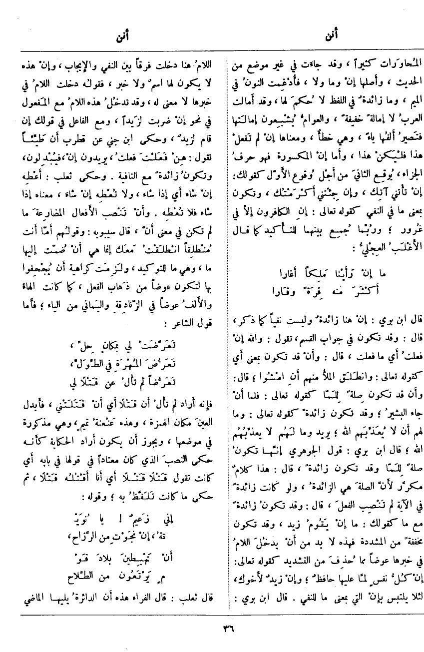 ؛ وإنْ زيدٌ لأَخوك، لِئَلَّا يَلْتَبِسَ بإنْ الَّتِي بِمَعْنَى مَا لِلنَّفْيِ. قَالَ ابْنُ بَرِّيٍّ: اللامُ هُنَا دَخَلَتْ فَرْقًا بَيْنَ النَّفْيِ والإِيجاب، وإنْ هَذِهِ لَا يَكُونُ لَهَا اسمٌ وَلَا خَبَرٌ، فقولُه دَخَلَتِ اللامُ فِي خَبَرِهَا لَا مَعْنَى لَهُ، وَقَدْ تدخُلُ هَذِهِ اللامُ مَعَ المَفعول فِي نَحْوِ إنْ ضَرَبْتُ لزَيداً، وَمَعَ الْفَاعِلِ فِي قَوْلِكَ إِنْ قَامَ لزيدٌ، وَحَكَى ابْنُ جِنِّي عَنْ قُطْرُبٍ أَن طَيِّئاً تَقُولُ: هِنْ فَعَلْتَ فعلتُ، يُرِيدُونَ إنْ، فيُبْدِلون، وَتَكُونُ زَائِدَةً مَعَ النَّافِيَةِ. وَحَكَى ثَعْلَبٌ: أَعْطِه إنْ شَاءَ أَي إِذَا شَاءَ، وَلَا تُعْطِه إنْ شاءَ، مَعْنَاهُ إِذَا شَاءَ فَلَا تُعْطِه. وأَنْ تَنْصب الأَفعال المضارِعة مَا لَمْ تَكُنْ فِي مَعْنَى أَنَّ، قَالَ سِيبَوَيْهِ: وقولُهم أَمَّا أَنت مُنْطلِقاً انْطلقْتُ مَعَك إِنَّمَا هِيَ أَنْ ضُمّت إِلَيْهَا مَا، وَهِيَ مَا لِلتَّوْكِيدِ، ولَزِمَت كَرَاهِيَةَ أَن يُجْحِفوا بِهَا لِتَكُونَ عِوَضًا مِنْ ذَهاب الْفِعْلِ، كَمَا كَانَتِ الهاءُ والأَلفُ عِوَضًا فِي الزّنادقةِ واليَماني مِنَ الْيَاءِ؛ فأَما قَوْلُ الشَّاعِرِ: