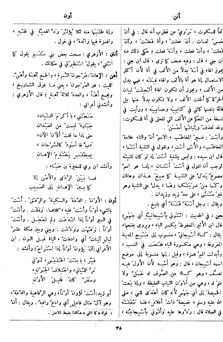 أَلفاً لِلسُّكُوتِ، مَرْويّ عَنْ قُطْرُبٍ أَنه قَالَ: فِي أَنَ خمسُ لُغَاتٍ: أَنَ فعلتُ، وأَنا فعلْتُ، وآنَ فَعلتُ، وأَنْ فَعَلْتُ، وأَنَهْ فَعَلْتُ؛ حَكَى ذَلِكَ عَنْهُ ابْنُ جِنِّي، قَالَ: وَفِيهِ ضَعْفٌ كَمَا تَرَى، قَالَ ابْنُ جِنِّي: يَجُوزُ الْهَاءُ فِي أَنَهْ بَدَلًا مِنَ الأَلف فِي أَنا لأَن أَكثر الِاسْتِعْمَالِ إِنَّمَا هُوَ أَنا بالأَلف وَالْهَاءِ قِبَلَه، فَهِيَ بَدَلٌ مِنَ الأَلف، وَيَجُوزُ أَن تَكُونَ الهاءُ أُلْحِقَتْ لِبَيَانِ الْحَرَكَةِ كَمَا أُلحقت الأَلف، وَلَا تَكُونُ بَدَلًا مِنْهَا بَلْ قَائِمَةً بِنَفْسِهَا كَالَّتِي فِي كتابِيَة وحسابِيَة، ورأَيت فِي نُسْخَةٍ مِنَ الْمُحْكَمِ عَنِ الأَلف الَّتِي تَلْحَقُ فِي أَنا لِلسُّكُوتِ: وَقَدْ تحذفُ وإثباتُها أَحْسَنُ. وأَنْتَ: ضميرُ المخاطَب، الاسمُ أَنْ وَالتَّاءُ علامةُ المخاطَب، والأُنثى أَنْتِ، وَتَقُولُ فِي التَّثْنِيَةِ أَنْتُما، قَالَ ابْنُ سِيدَهْ: وَلَيْسَ بتثنيةِ أَنْتَ إِذْ لَوْ كَانَ تثنيتَه لَوَجَبَ أَن تَقُولَ فِي أَنْتَ أَنْتانِ، إِنَّمَا هُوَ اسمٌ مصوغٌ يَدُلُّ عَلَى التَّثْنِيَةِ كَمَا صيغَ هَذَانِ وَهَاتَانِ وكُما مِنْ ضرَبْتُكما وهُما، يدلُّ عَلَى التَّثْنِيَةِ وَهُوَ غيرُ مُثَنًّى، عَلَى حَدِّ زَيْدٍ وَزَيْدَانِ. وَيُقَالُ: رَجُلٌ أُنَنَةٌ قُنَنَةٌ أَي بليغ.