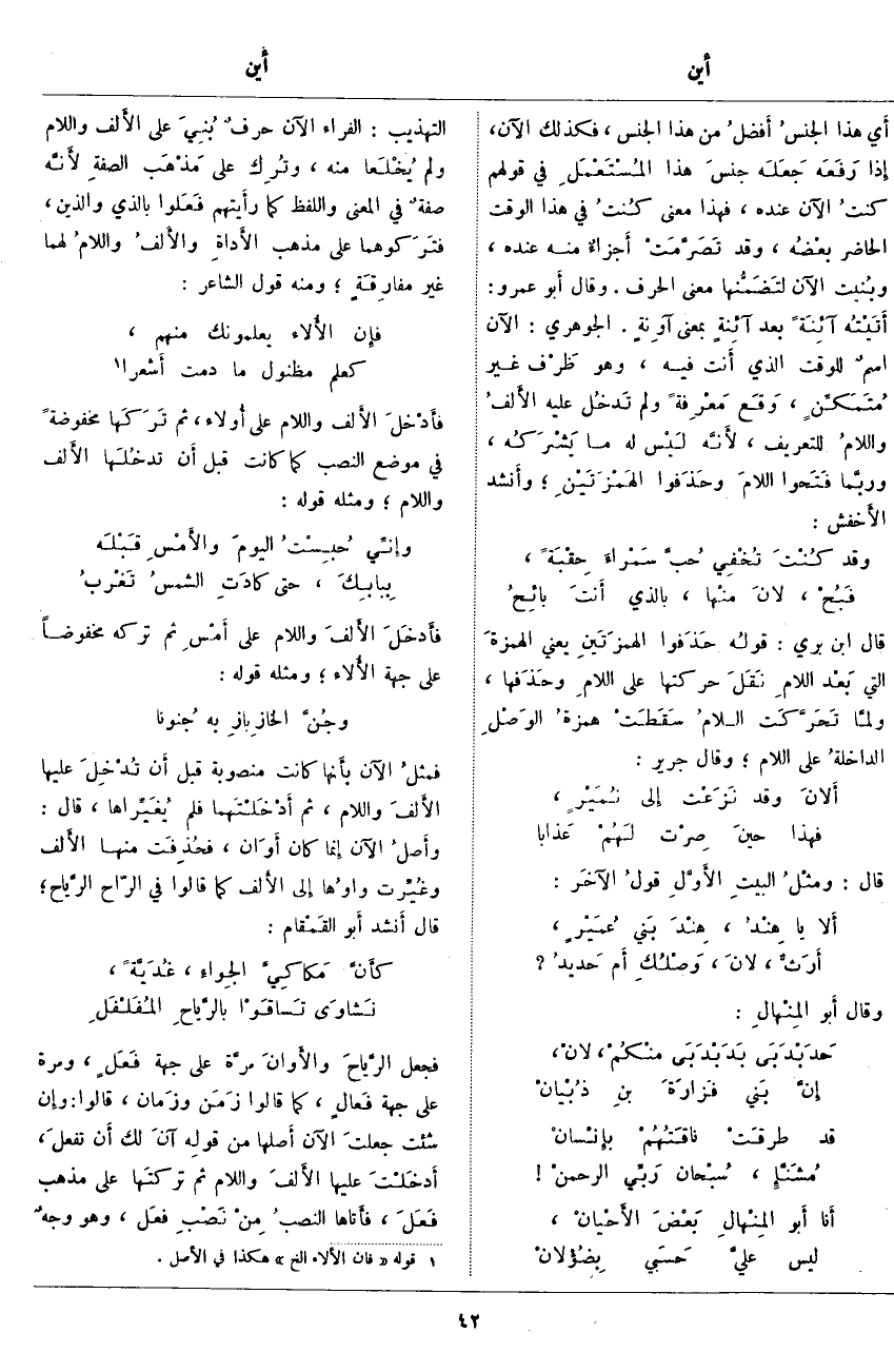 . التَّهْذِيبُ: الْفَرَّاءُ الْآنَ حرفٌ بُنِيَ عَلَى الأَلف وَاللَّامِ وَلَمْ يُخْلَعا مِنْهُ، وتُرِك عَلَى مَذْهَب الصفةِ لأَنَّه صفةٌ فِي الْمَعْنَى وَاللَّفْظِ كَمَا رأَيتهم فَعَلوا بِالَّذِي وَالَّذِينَ، فَتَرَكوهما عَلَى مَذْهَبِ الأَداةِ والأَلفُ واللامُ لَهُمَا غَيْرُ مفارِقَةٍ؛ وَمِنْهُ قَوْلُ الشَّاعِرِ: