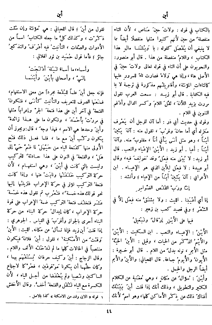 . فَإِنَّهُ جَعَلَ أَينَ عَلَمًا للبُقْعة مُجَرَّدًا مِنْ مَعْنَى الِاسْتِفْهَامِ، فمنَعَها الصَّرْفَ لِلتَّعْرِيفِ والتأْنيث كأُنَى، فتكونُ الفتحةُ فِي آخِرِ أَين عَلَى هَذَا فتحةَ الجرِّ وَإِعْرَابًا مِثْلَهَا فِي مررْتُ بأَحْمَدَ، وَتَكُونُ مَا عَلَى هَذَا زَائِدَةً وأَينَ وَحْدَهَا هِيَ الِاسْمُ، فَهَذَا وجهٌ، قَالَ: وَيَجُوزُ أَن يَكُونَ ركَّب أَينَ مَعَ مَا، فَلَمَّا فَعَلَ ذَلِكَ فَتَحَ الأُولى مِنْهَا كَفَتْحَةِ الْيَاءِ مِنْ حَيَّهَلْ لَمَّا ضُمَّ حَيَّ إِلَى هَلْ، والفتحةُ فِي النُّونِ عَلَى هَذَا حادثةٌ لِلتَّرْكِيبِ وَلَيْسَتْ بِالَّتِي كَانَتْ فِي أَيْنَ، وَهِيَ اسْتِفْهَامٌ، لأَن حَرَكَةَ التَّرْكِيبِ خَلَفَتْها ونابَتْ عَنْهَا، وَإِذَا كَانَتْ فتحةُ التَّرْكِيبِ تؤَثر فِي حَرَكَةِ الإِعراب فتزيلُها إِلَيْهَا نَحْوَ قَوْلِكَ هَذِهِ خمسةٌ، فتُعْرِب ثُمَّ تَقُولُ هَذِهِ خمْسةَ عشَر فتخلُف فتحةُ التَّرْكِيبِ ضمةَ الإِعراب عَلَى قُوَّةِ حَرَكَةِ الإِعراب، كَانَ إبدالُ حَرَكَةِ الْبِنَاءِ مِنْ حَرَكَةِ الْبِنَاءِ أَحرى بِالْجَوَازِ وأَقرَبَ فِي الْقِيَاسِ. الْجَوْهَرِيُّ: إِذَا قلتَ أَين زَيْدٌ فَإِنَّمَا تسأَلُ عَنْ مَكَانِهِ. اللَّيْثُ: الأَينُ وقتٌ مِنَ الأَمْكِنة «1». تَقُولُ: أَينَ فلانٌ فَيَكُونُ مُنْتَصِبًا فِي الْحَالَاتِ كُلِّهَا مَا لَمْ تَدْخُلْه الأَلف وَاللَّامُ. وَقَالَ الزَّجَّاجُ: أَينَ وَكَيْفَ حَرْفَانِ يُسْتَفْهَم بِهِمَا، وَكَانَ حقُّهما أَن يَكُونَا مَوْقوفَين، فحُرِّكا لِاجْتِمَاعِ السَّاكِنَيْنِ ونُصِبا وَلَمْ يُخْفَضا مِنْ أَجل الْيَاءِ، لأَن الْكَسْرَةَ مَعَ الْيَاءِ تَثْقُل والفتحةُ أَخفُّ. وقال الأَخفش