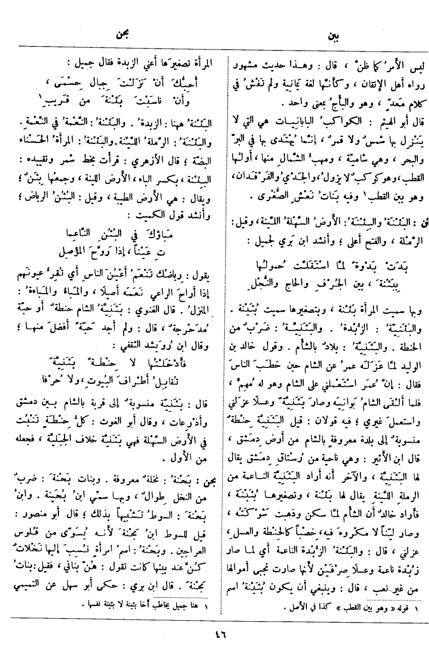 يَقُولُ: رِياضُك تَنْعَمُ أَعْيُنَ الناسِ أَي تُقِرُّ عيونَهم إِذَا أَراحَ الرَّاعِي نَعَمَه أَصيلًا، والمَباءُ والمَباءةُ: المنزلُ. قَالَ الْغَنَوِيُّ: بَثَنِيَّةُ الشَّامِ حنطةٌ أَو حَبَّةٌ مُدَحْرجَةٌ، قَالَ: وَلَمْ أَجد حَبّةً أَفضلَ مِنْهَا؛ وَقَالَ ابْنُ رُوَيشد الثَّقَفِيُّ: