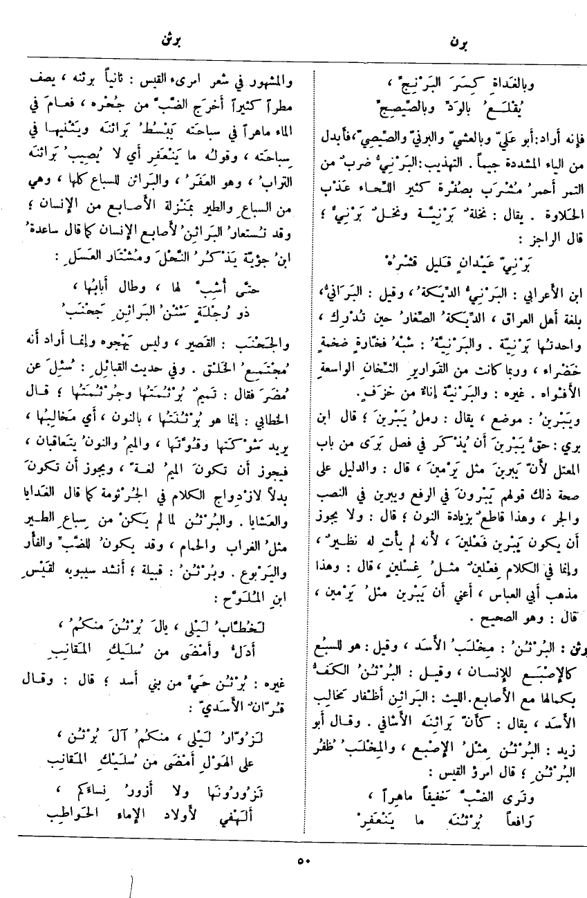 وَالْمَشْهُورُ فِي شِعْرِ امْرِئِ الْقَيْسِ: ثَانِيًا بُرْثُنَهُ، يَصِفُ مَطَرًا كَثِيرًا أَخرجَ الضَّبَّ مِنْ جُحْره، فعامَ فِي الْمَاءِ مَاهِرًا فِي سباحَته يَبْسُطُ بَراثْنه ويَثْنيها فِي سِباحَته، وقولُه مَا يَنْعَفِر أَي لَا يُصِيبُ بَراثنَه الترابُ، وَهُوَ العَفَرُ، والبَراثن لِلسِّبَاعِ كُلِّهَا، وَهِيَ مِنَ السباعِ وَالطَّيْرِ بمَنْزلة الأَصابع مِنَ الإِنسان؛ وَقَدْ تُستعارُ البَراثِنُ لأَصابع الإِنسان كَمَا قال ساعدةُ ابنُ جُؤَيَّةَ يَذْكُرُ النَّحْلَ ومُشْتَار العَسَلِ: