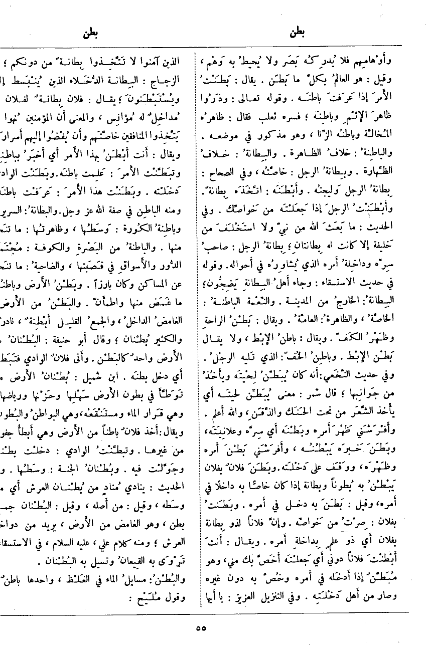 ؛ قَالَ الزَّجَّاجُ: البِطانة الدُّخَلاء الَّذِينَ يُنْبَسط إِلَيْهِمْ ويُسْتَبْطَنونَ؛ يُقَالُ: فُلَانٌ بِطانةٌ لِفُلَانٍ أَي مُداخِلٌ لَهُ مُؤانِس، وَالْمَعْنَى أَن الْمُؤْمِنِينَ نُهوا أَن يَتَّخِذوا الْمُنَافِقِينَ خاصَّتَهم وأَن يُفْضُوا إِلَيْهِمْ أَسرارَهم. وَيُقَالُ: أَنت أَبْطَنُ بِهَذَا الأَمر أَي أَخبَرُ بباطِنِه. وتبَطَّنْت الأَمرَ: عَلِمت باطنَه. وبَطَنْت الْوَادِي: دَخَلْته. وبَطَنْت هَذَا الأَمرَ: عَرَفْت باطنَه، وَمِنْهُ الباطِن فِي صِفَةِ اللَّهِ عَزَّ وَجَلَّ. والبطانةُ: السريرةُ. وباطِنةُ الكُورة: وَسَطُها، وظاهرتُها: مَا تنَحَّى مِنْهَا. والباطنةُ مِنَ البَصْرةِ وَالْكُوفَةِ: مُجْتَمَعُ الدُّور والأَسواقِ فِي قَصَبتها، والضاحيةُ: مَا تنَحَّى عَنِ الْمَسَاكِنِ وَكَانَ بَارِزًا. وبَطْنُ الأَرض وباطنُها: مَا غَمَض مِنْهَا واطمأَنّ. والبَطْنُ مِنَ الأَرض: الغامضُ الداخلُ، والجمعُ الْقَلِيلُ أَبْطِنةٌ، نادرٌ، وَالْكَثِيرُ بُطْنان؛ وَقَالَ أَبو حَنِيفَةَ: البُطْنانُ مِنَ الأَرض واحدٌ كالبَطْن. وأَتى فلانٌ الْوَادِيَ فتَبَطَّنه أَي دَخَلَ بطنَه. ابْنُ شُمَيْلٍ: بُطْنانُ الأَرض مَا تَوَطَّأَ فِي بُطُونِ الأَرض سَهْلِها وحَزْنها وَرِيَاضِهَا، وَهِيَ قَرار الْمَاءِ ومستَنْقَعُه، وَهِيَ البواطنُ والبُطون. وَيُقَالُ: أَخذ فلانٌ بَاطِنًا مِنَ الأَرض وَهِيَ أَبطأُ جُفُوفًا مِنْ غَيْرِهَا. وتبطَّنْتُ الْوَادِي: دخلْت بطْنه وجَوَّلْت فِيهِ. وبُطْنانُ الْجَنَّةِ: وسَطُها. وَفِي الْحَدِيثِ: