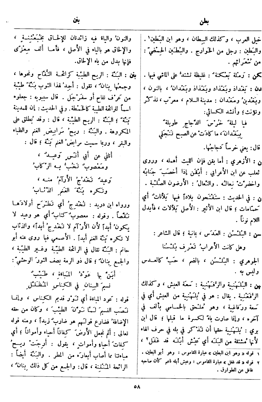 بنن: البَنَّة: الرِّيحُ الطيِّبة كَرَائِحَةِ التُّفّاح وَنَحْوِهَا، وجمعُها بِنانٌ، تَقُولُ: أَجِدُ لِهَذَا الثَّوْبِ بَنَّةً طيِّبة مِنْ عَرْف تُفَّاحٍ أَو سَفَرْجَل. قَالَ سِيبَوَيْهِ: جَعَلُوهُ اسْمًا لِلرَّائِحَةِ الطَّيِّبَةِ كالخَمْطة. وَفِي الْحَدِيثِ: