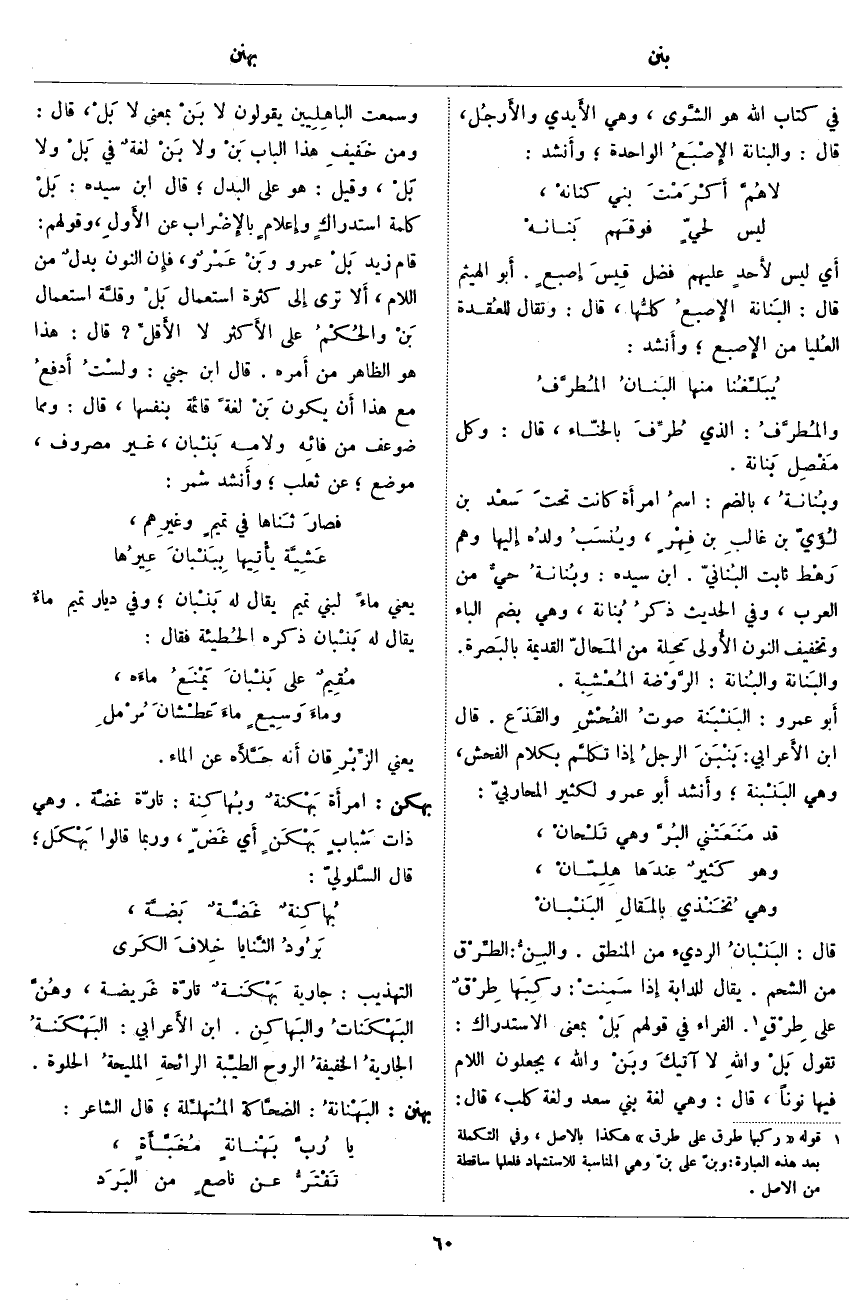 قَالَ: البَنْبانُ الرَّدِيءُ مِنَ الْمَنْطِقِ والبِنُّ: الطِّرْق مِنَ الشَّحْمِ يُقَالُ لِلدَّابَّةِ إِذا سَمِنتْ: ركِبَها طِرْقٌ عَلَى طِرْقٍ «2» الْفَرَّاءُ فِي قَوْلِهِمْ بَلْ بِمَعْنَى الِاسْتِدْرَاكِ: تَقُولُ بَلْ واللهِ لَا آتيكَ وبَنْ وَاللَّهِ، يَجْعَلُونَ اللَّامَ فِيهَا نُونًا، قَالَ: وَهِيَ لُغَةُ بَنِي سَعْدٍ وَلُغَةُ كَلْبٍ، قَالَ: وَسَمِعْتُ الباهِلِيين يَقُولُونَ لَا بَنْ بِمَعْنَى لَا بَلْ، قَالَ: وَمِنْ خَفيفِ هَذَا الْبَابِ بَنْ وَلَا بَنْ لغةٌ فِي بَلْ وَلَا بَلْ، وَقِيلَ: هُوَ عَلَى الْبَدَلِ؛ قَالَ ابْنُ سِيدَهْ: بَلْ كَلِمَةُ استدراكٍ وإِعلامٍ بالإِضْراب عَنِ الأَولِ، وَقَوْلُهُمْ: قَامَ زَيْدٌ بَلْ عَمْروٌ وبَنْ عَمْروٌ، فَإِنَّ النُّونَ بدلٌ مِنَ اللَّامِ، أَلا تَرَى إِلَى كَثْرَةِ اسْتِعْمَالِ بَلْ وقلَّة اسْتِعْمَالِ بَنْ والحُكْمُ عَلَى الأَكثر لَا الأَقلِّ؟ قَالَ: هَذَا هُوَ الظَّاهِرُ مِنْ أَمره قَالَ ابْنُ جِنِّيٍّ: ولسْتُ أَدفعُ مَعَ هَذَا أَن يَكُونَ بَنْ لُغَةً قَائِمَةً بِنَفْسِهَا، قَالَ: وَمِمَّا ضُوعِفَ مِنْ فائِه ولامِه بَنْبان، غَيْرُ مَصْرُوفٍ، مَوْضِعٌ؛ عَنْ ثَعْلَبٍ؛ وأَنشد شَمِرٌ: