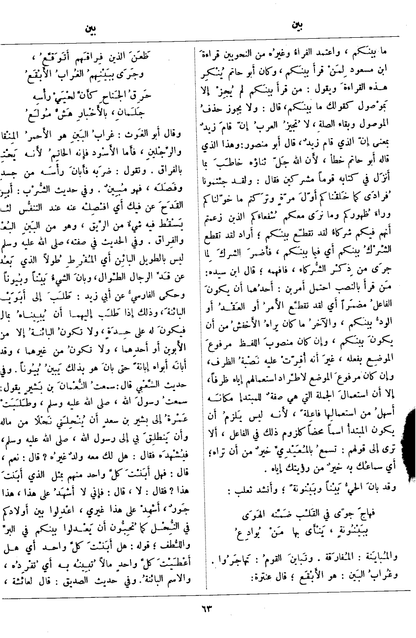 ؛ أَراد لَقَدْ تَقَطَّعَ الشِّرْكُ بَيْنَكُمْ أَي فِيمَا بينَكم، فأَضمرَ الشركَ لِمَا جرَى مِنْ ذِكْر الشُّركاء، فَافْهَمْهُ؛ قَالَ ابْنُ سِيدَهْ: مَن قرأَ بِالنَّصْبِ احْتَمَلَ أَمرين: أَحدُهما أَن يكونَ الفاعلُ مضمَراً أَي لَقَدْ تقطَّع الأَمرُ أَو العَقْدُ أَو الودُّ بينَكم، والآخرُ مَا كَانَ يراهُ الأَخفشُ مِنْ أَن يكونَ بَيْنَكُمْ، وَإِنْ كَانَ منصوبَ اللَّفْظِ مرفوعَ الموضِع بِفِعْلِهِ، غيرَ أَنه أُقِرّتْ عَلَيْهِ نَصْبةُ الظَّرْفِ، وَإِنْ كَانَ مرفوعَ الْمَوْضِعِ لاطِّراد اسْتِعْمَالِهِمْ إِيَّاهُ ظَرْفًا، إِلَّا أَن استعمالَ الْجُمْلَةِ الَّتِي هِيَ صفةٌ لِلْمُبْتَدَإِ مكانَه أَسهلُ مِنِ استعمالِها فاعِلةً، لأَنه لَيْسَ يَلزمُ أَن يَكُونَ المبتدأُ اسْمًا مَحْضًا كَلُزُومِ ذَلِكَ فِي الْفَاعِلِ، أَلا تَرَى إِلَى قَوْلِهِمْ: تسمعُ بالمُعَيْدِيِّ خيرٌ مِنْ أَن تَرَاهُ؛ أَي سماعُك بِهِ خيرٌ مِنْ رؤْيتك إِيَّاهُ. وَقَدْ بانَ الحيُّ بَيْناً وبَيْنونةً؛ وأَنشد ثَعْلَبٌ: