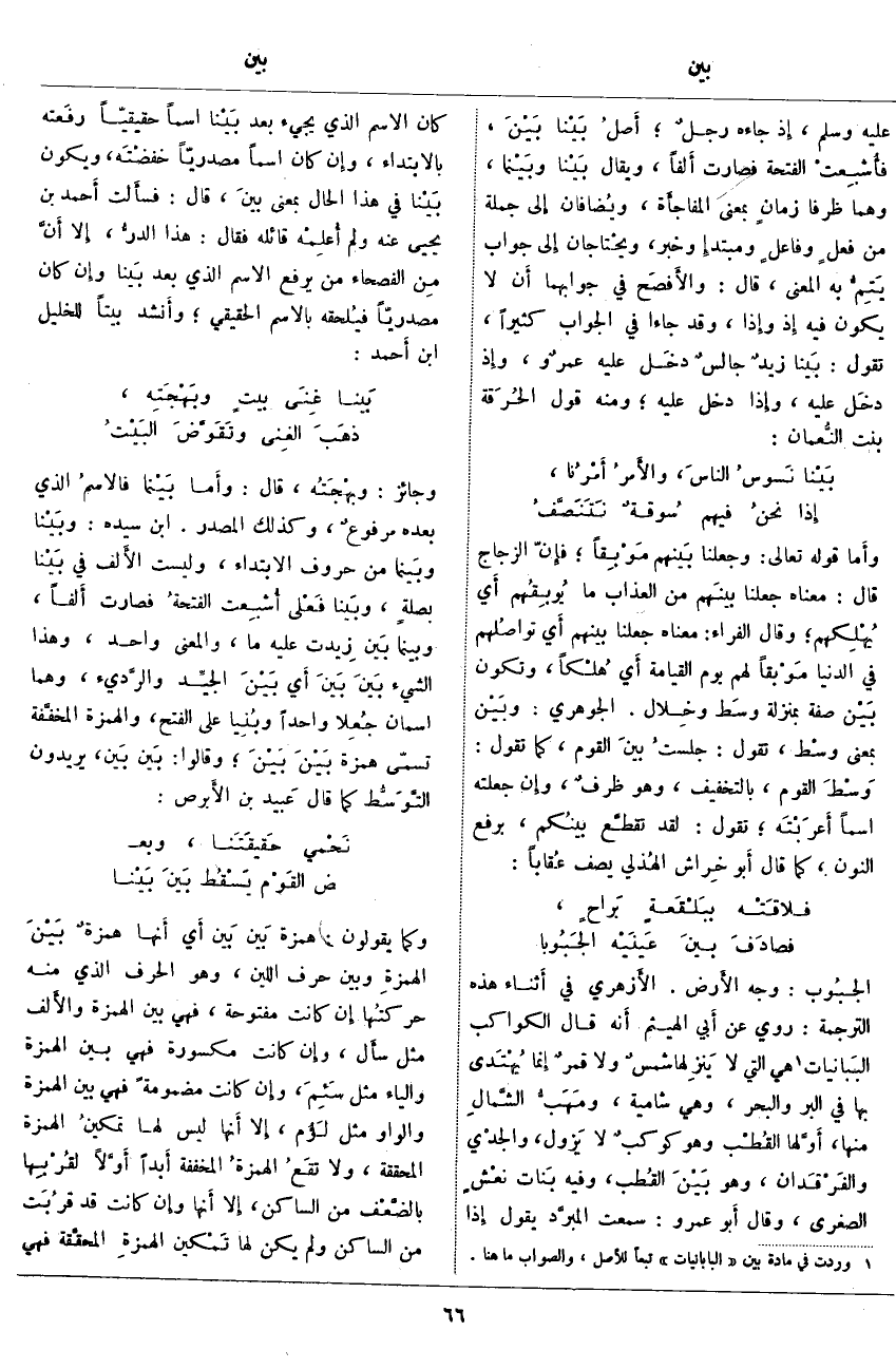 وَجَائِزٌ: وبهْجَتُه، قَالَ: وأَما بَيْنما فالاسمُ الَّذِي بَعْدَهُ مرفوعٌ، وَكَذَلِكَ الْمَصْدَرُ. ابْنُ سِيدَهْ: وبَيْنا وَبَيْنَمَا مِنْ حُرُوفِ الِابْتِدَاءِ، وَلَيْسَتِ الأَلف فِي بَيْنا بصلةٍ، وبَينا فعْلى أُشبِعت الفتحةُ فَصَارَتْ أَلفاً، وَبَيْنَمَا بَين زِيدت عَلَيْهِ مَا، وَالْمَعْنَى وَاحِدٌ، وَهَذَا الشَّيْءُ بَينَ بَينَ أَي بَيْنَ الجيِّد والرَّديء، وَهُمَا اسْمَانِ جُعِلا وَاحِدًا وبُنيا عَلَى الْفَتْحِ، وَالْهَمْزَةُ المخفَّفة تُسَمَّى هَمْزَةٌ بَيْنَ بَيْنَ؛ وَقَالُوا: بَين بَين، يُرِيدُونَ التَّوَسُّط كَمَا قَالَ عَبيد بْنُ الأَبرص:
