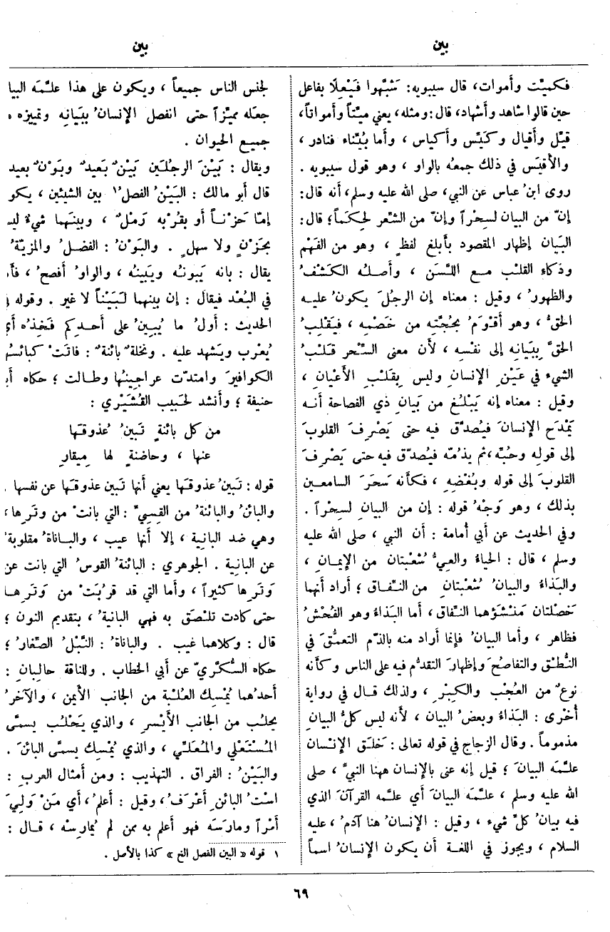 أَي علَّمه القرآنَ الَّذِي فِيهِ بيانُ كلِّ شَيْءٍ، وَقِيلَ: الإِنسانُ هَنَا آدمُ، عَلَيْهِ السَّلَامُ، وَيَجُوزُ فِي اللُّغَةِ أَن يَكُونَ الإِنسانُ اسْمًا لِجِنْسِ النَّاسِ جَمِيعًا، وَيَكُونُ عَلَى هَذَا علَّمَه البيانَ جعَله مميِّزاً حَتَّى انْفَصَلَ الإِنسانُ ببيَانِه وَتَمْيِيزِهِ مِنْ جَمِيعِ الْحَيَوَانِ. وَيُقَالُ: بَيْنَ الرجُلَين بَيْنٌ بَعيدٌ وبَوْنٌ بَعِيدٌ؛ قَالَ أَبو مَالِكٍ: البَيْنُ الفصلُ «2». بَيْنَ الشَّيْئَيْنِ، يَكُونُ إِمَّا حَزْناً أَو بقُرْبه رَمْلٌ، وبينَهما شيءٌ لَيْسَ بحَزنٍ وَلَا سهلٍ. والبَوْنُ: الفضلُ والمزيّةُ. يُقَالُ: بَانَهُ يَبونُه ويَبينُه، والواوُ أَفصحُ، فأَما فِي البُعْد فَيُقَالُ: إِنَّ بَيْنَهُمَا لَبَيْناً لَا غَيْرَ. وَقَوْلُهُ فِي الْحَدِيثِ: