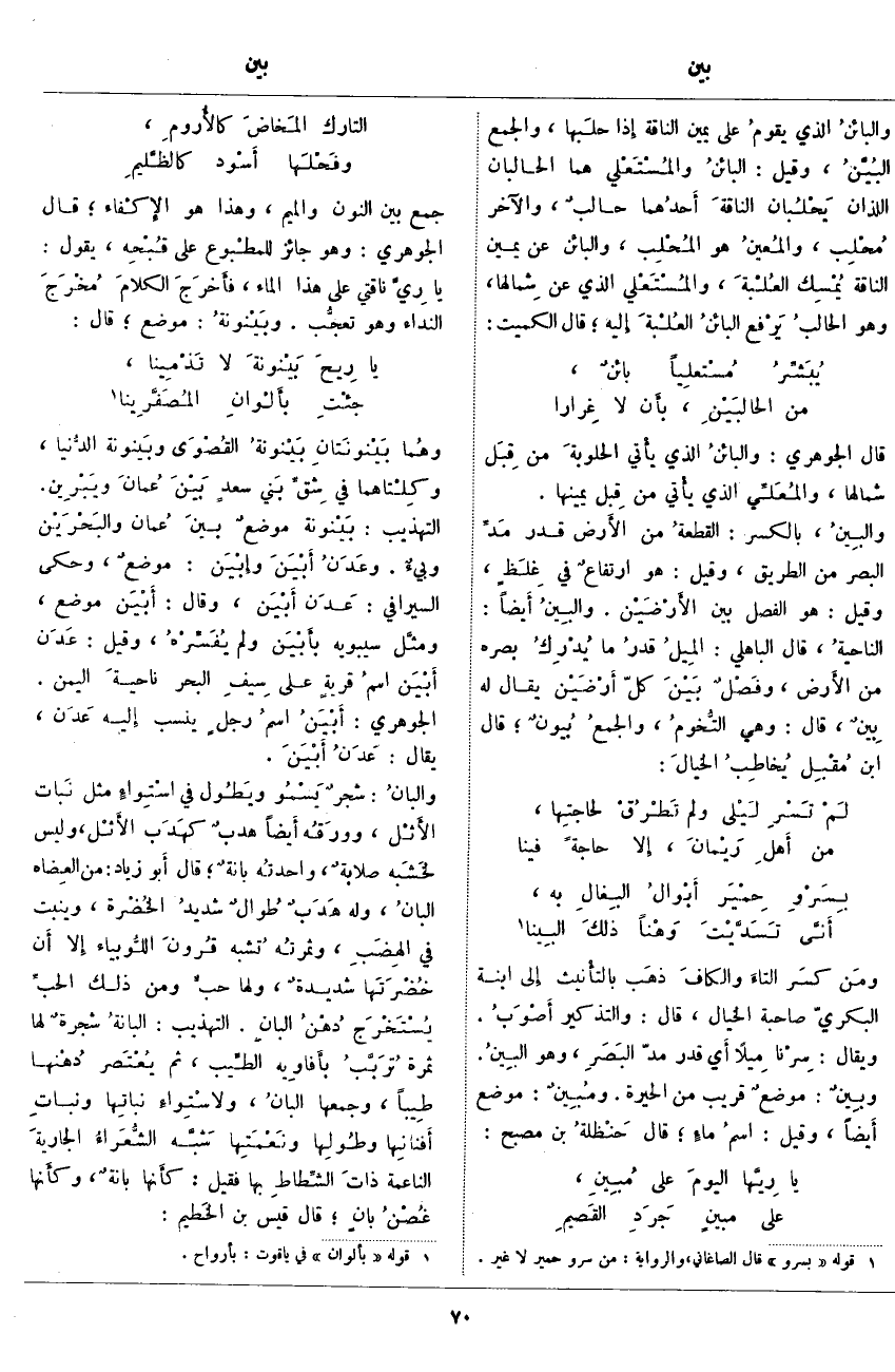 . وهُما بَيْنونَتانِ بَيْنونةُ القُصْوَى وبَينونة الدُّنيا، وكِلْتاهما فِي شِقِّ بَنِي سعدٍ بَيْنَ عُمانَ ويَبْرِين. التَّهْذِيبُ: بَيْنونة موضعٌ بينَ عُمان والبحرَيْن وبيءٌ. وعَدَنُ أَبْيَنَ وإِبْيَن: موضعٌ، وَحَكَى السِّيرَافِيُّ: عَدَن أَبْيَن، وَقَالَ: أَبْيَن مَوْضِعٌ، ومثَّل سِيبَوَيْهِ بأَبْيَن وَلَمْ يُفَسِّرْهُ، وَقِيلَ: عَدَن أَبْيَن اسمُ قريةٍ عَلَى سيفِ الْبَحْرِ ناحيةَ الْيَمَنِ. الْجَوْهَرِيُّ: أَبْيَنُ اسمُ رجلٍ يُنْسَبُ إِلَيْهِ عَدَن، يُقَالُ: عَدَنُ أَبْيَنَ. والبانُ: شجرٌ يَسْمُو ويَطُول فِي اسْتِواءٍ مِثْلُ نَبات الأَثْل، وورَقُه أَيضاً هدبٌ كهَدَب الأَثْل، وَلَيْسَ لخَشَبه صلابةٌ، واحدتُه بانةٌ؛ قَالَ أَبو زِيَادٍ: مِنَ العِضاه البانُ، وَلَهُ هَدَبٌ طُوالٌ شديدُ الخُضْرة، وَيَنْبُتُ فِي الهِضَبِ، وثمرتُه تُشبه قُرونَ اللُّوبياء إِلَّا أَن خُضْرَتَها شديدةٌ، وَلَهَا حبٌّ وَمِنْ ذَلِكَ الحبِّ يُسْتَخْرَج دُهْنُ البانِ. التَّهْذِيبُ: البانةُ شجرةٌ لَهَا ثَمَرَةٌ تُرَبَّبُ بأَفاوِيه الطِّيب، ثُمَّ يُعْتَصر دُهْنها طِيباً، وَجَمْعُهَا البانُ، ولاسْتِواءِ نباتِها ونباتِ أَفنانِها وطُولِها ونَعْمَتِها شَبَّه الشُّعَراءُ الجاريةَ النَّاعِمَةَ ذاتَ الشِّطاطِ بِهَا فَقِيلَ: كأَنها بانةٌ، وكأَنها غُصْنُ بانٍ؛ قَالَ قَيْسُ بْنُ الخَطيم: