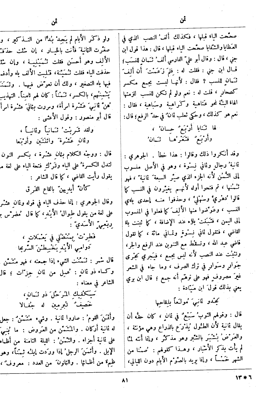 صحَّحت الياءَ قَبْلَهَا، فَكَذَلِكَ أَلفُ النَّصْبِ الَّذِي فِي العَظايا وَالشِّفَايَا صحَّحت الْيَاءَ قَبْلَهَا، قَالَ: هَذَا قَوْلُ ابْنِ جِنِّي، قَالَ: وَقَالَ أَبو عَلِيٍّ الْفَارِسِيُّ أَلفُ ثَمانٍ للنسَبِ؛ قَالَ ابْنُ جِنِّي: فَقُلْتُ لَهُ: فلِمَ زَعَمْتَ أَن أَلِفَ ثَمانٍ لِلنَّسَبِ؟ فَقَالَ: لأَنها لَيْسَتْ بِجَمْعٍ مُكَسَّرٍ كصحارٍ، قُلْتُ لَهُ: نَعَمْ وَلَوْ لَمْ تَكُنْ لِلنَّسَبِ لَلَزِمَتْهَا الهاءُ البتَّة نَحْوَ عَتاهية وكراهِية وسَباهية، فَقَالَ: نَعَمْ هُوَ كَذَلِكَ، وَحَكَى ثَعْلَبٌ ثمانٌ في حدّ الرفع؛ قَالَ: