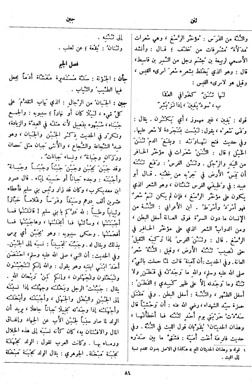 ؛ قَالَ: الثُّنَنُ شعَرات فِي مُؤَخَّر الْحَافِرِ مِنَ اليَدِ والرِّجْل. وثَنَّن الفرسُ: رَفَع ثُنَّتَه أَن يَمَسَّ الأَرض فِي جَرْيه مِنْ خِفَّتِه. قَالَ أَبو عُبَيْدٍ: فِي وَظِيفَي الْفَرَسِ ثُنَّتان، وَهُوَ الشَّعْرُ الَّذِي يَكُونُ عَلَى مُؤخَّر الرُّسْغ، فَإِنْ لَمْ يَكُنْ ثَمَّ شعرٌ فَهُوَ أَمْرَدُ وأَمْرَطُ. ابْنُ الأَعرابي: الثُّنَّة مِنَ الإِنسان مَا دُونُ السُّرَّةِ فَوْقَ الْعَانَةِ أَسفل الْبَطْنِ، وَمِنَ الدوابِّ الشَّعْرُ الَّذِي عَلَى مؤخَّر الحافِر فِي الرُّسْغ. قَالَ: وثَنَّنَ الفرسُ إِذَا رَكِبَه الثقيلُ حَتَّى تُصِيبَ ثُنَّتُه الأَرض، وَقِيلَ: الثُّنَّةُ شعرُ الْعَانَةِ. وَفِي الْحَدِيثِ: