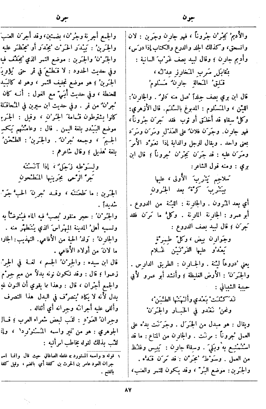 . الجَرين: مَا طَحَنتَه، وَقَدْ جُرِنَ الحبُّ جَرْناً شَدِيدًا. والجُرْنُ: حَجَرٌ مَنْقُورٌ يُصبُّ فِيهِ الْمَاءُ فيُتوضأُ بِهِ، وَتُسَمِّيهِ أَهلُ الْمَدِينَةِ المِهْراسَ الَّذِي يُتَطهَّر مِنْهُ. والجارِنُ: ولدُ الْحَيَّةِ مِنَ الأَفاعي. التَّهْذِيبُ: الْجَارِنُ مَا لانَ مِنْ أَولاد الأَفاعي. قَالَ ابْنُ سِيدَهْ: والجِرْنُ الْجِسْمُ، لُغَةٌ فِي الجِرْم زَعَمُوا؛ قَالَ: وَقَدْ تَكُونُ نُونُهُ بَدَلًا مِنْ مِيمِ جِرْم، وَالْجَمْعُ أَجْران، قَالَ: وَهَذَا مِمَّا يُقَوِّي أَن النُّونَ غَيْرُ بَدَلٍ لأَنه لَا يَكَادُ يُتصرَّف فِي الْبَدَلِ هَذَا التَّصَرُّفَ. وأَلقى عَلَيْهِ أَجرانَه وجِرانه أَي أَثقاله. وجِرانُ العَوْدِ: لقَب لِبَعْضِ شُعَرَاءِ الْعَرَبِ؛ قَالَ الْجَوْهَرِيُّ: هُوَ مِنْ نُمير وَاسْمُهُ المُسْتورِد «2». وَإِنَّمَا لقِّب بِذَلِكَ لِقَوْلِهِ يخاطب امرأَتيه: