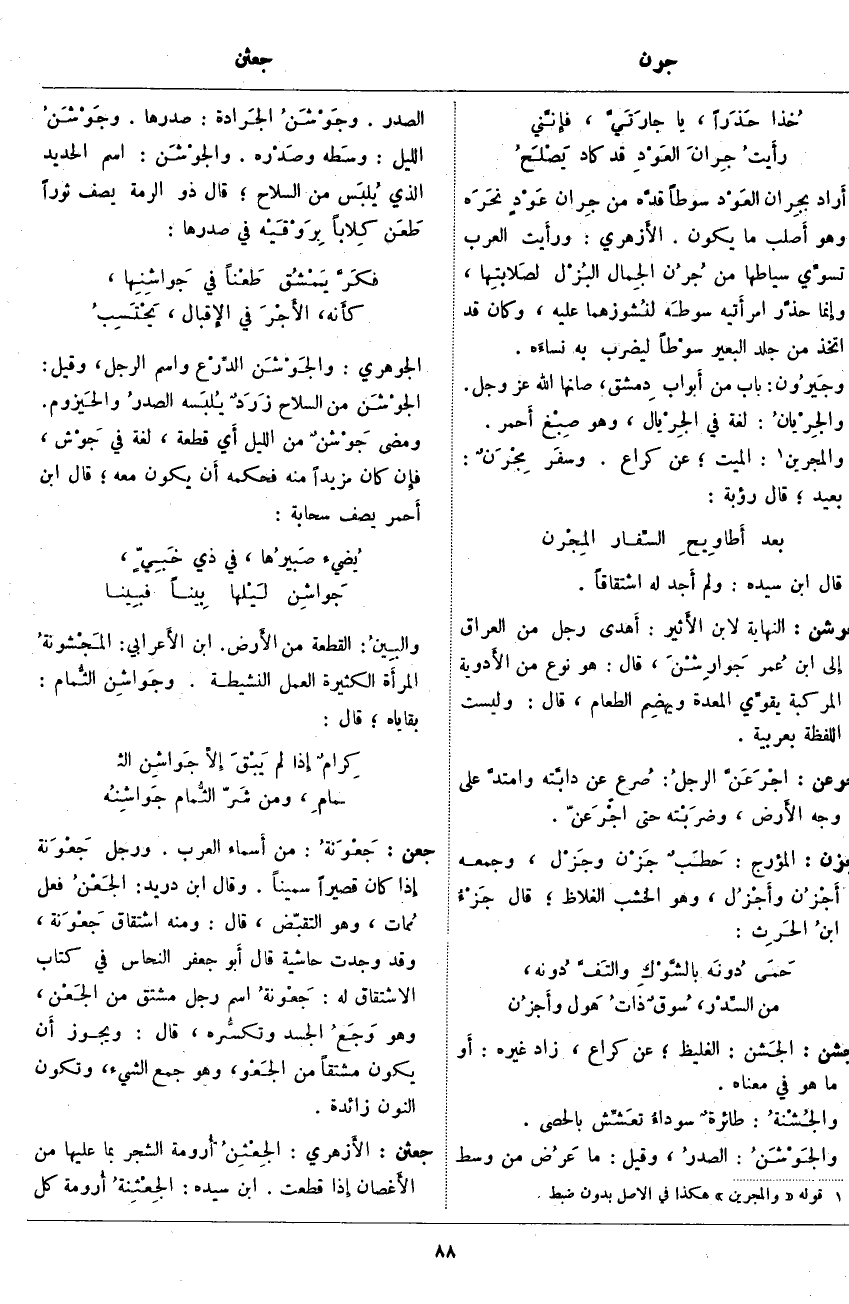 جرشن: النِّهَايَةُ لِابْنِ الأَثير: أَهدى رَجُلٌ مِنَ الْعِرَاقِ إِلَى ابْنِ عُمر جَوارِشْنَ، قَالَ: هُوَ نَوْعٌ مِنَ الأَدوية الْمُرَكَّبَةِ يقوِّي الْمَعِدَةَ ويهضِم الطَّعَامَ، قَالَ: وَلَيْسَتِ اللفظة بعربية.