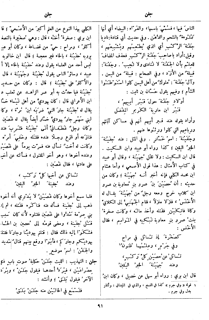 . قَالَ ابْنُ بَرِّيٍّ: رَوَاهُ أَبو سَهْلٍ عَنْ خَصِيلٍ، وَكَانَ ابنُ الْكَلْبِيِّ بِهَذَا النَّوْعِ مِنَ الْعِلْمِ أَكبرَ مِنَ الأَصمعي؛ قَالَ ابْنُ بَرِّيٍّ: صخرةُ أُخْتُه، قَالَ: وَهِيَ صُخَيرة بِالتَّصْغِيرِ أَكثرُ، وَمَرَاحٌ: حَيٌّ مِنْ قُضَاعَةَ، وَكَانَ أَبو عُبَيْدٍ يَرْوِيهِ حُفَيْنة، بِالْحَاءِ غَيْرَ مُعْجَمَةٍ؛ قَالَ ابْنُ خَالَوَيْهِ: لَيْسَ أَحد مِنَ الْعُلَمَاءِ يَقُولُ وَعِنْدَ حُفَيْنة بِالْحَاءِ إِلَّا أَبو عُبَيْدٍ، وسائرُ النَّاسِ يَقُولُ جُفَيْنة وجُهَيْنة، قَالَ: والأَكثرُ عَلَى جُفَيْنة؛ قَالَ: وَكَانَ مِنْ حَدِيثِ