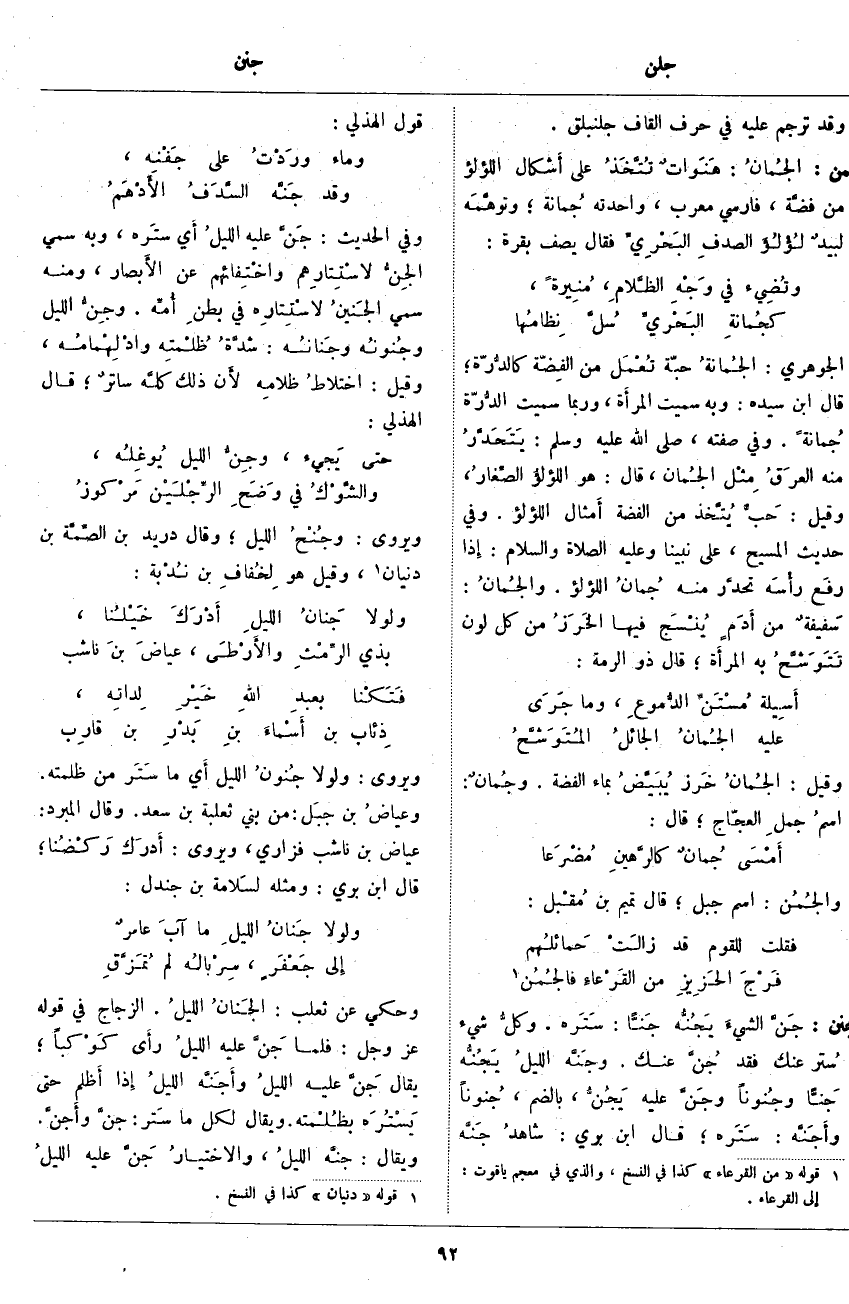 جمن: الجُمانُ: هَنَواتٌ تُتَّخَذُ عَلَى أَشكال اللُّؤْلُؤِ مِنْ فضَّة، فَارِسِيٌّ مُعَرَّبٌ، وَاحِدَتُهُ جُمانة؛ وتوهَّمَه لبيدٌ لُؤلُؤَ الصدفِ البَحْرِيِّ فَقَالَ يَصِفُ بَقَرَةً: