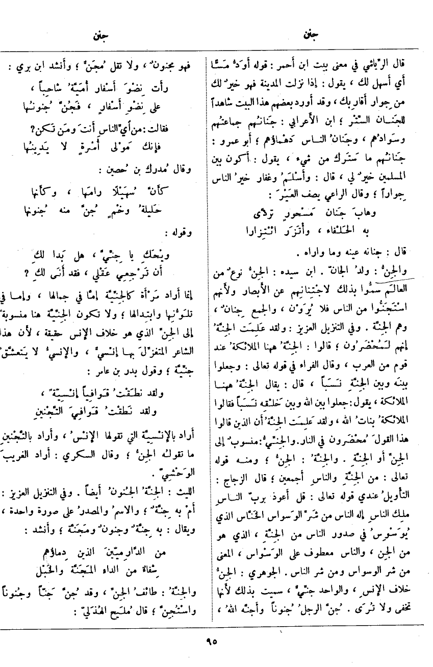 ، الَّذِي هُوَ مِنِ الجِن، وَالنَّاسِ مَعْطُوفٌ عَلَى الوَسْوَاس، الْمَعْنَى مِنْ شَرِّ الْوَسْوَاسِ وَمِنْ شَرِّ النَّاسِ. الْجَوْهَرِيُّ: الجِنُّ خِلَافُ الإِنسِ، وَالْوَاحِدُ جنِّيٌّ، سُمِّيَتْ بِذَلِكَ لأَنها تَخْفَى وَلَا تُرَى. جُنَّ الرجلُ جُنوناً وأَجنَّه اللهُ، فَهُوَ مجنونٌ، وَلَا تَقُلْ مُجَنٌّ؛ وأَنشد ابْنُ بَرِّيٍّ: