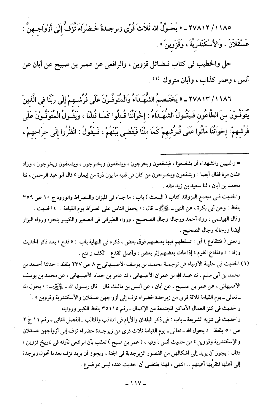 1185/ 27812 - "يُحَولُّ اللَّه ثَلَاثَ قُرًى زبرجدةً خَضْرَاءَ تُزَفُّ إِلَى أَزْوَاجِهِنَّ: عَسْقَلَانَ، وَالأسْكَنْدَرِيَّةَ، وَقَزْوِينَ".