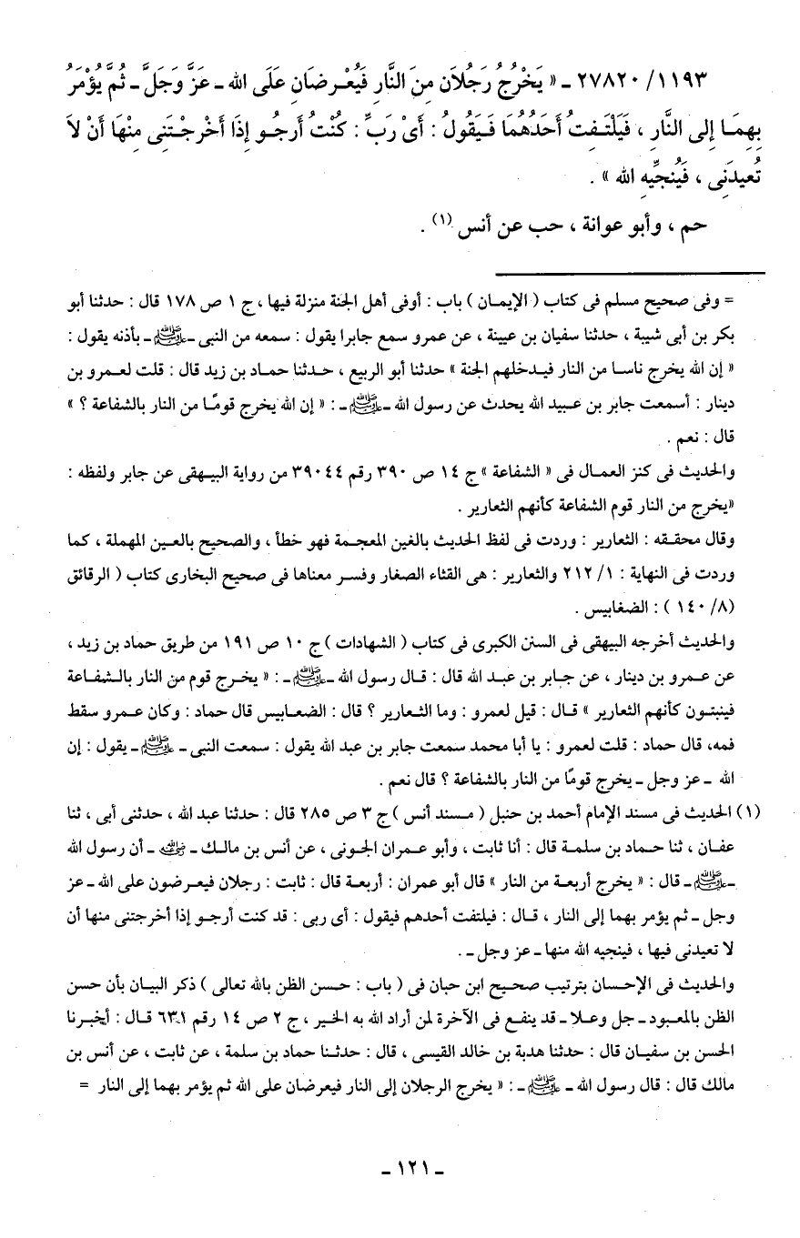 (¬1) الحديث في مسند الإمام أحمد بن حنبل (مسند أنس) جـ 3 ص 285 قال: حدثنا عبد اللَّه، حدثنى أَبى، ثنا عفان، ثنا حماد بن سلمة قال: أنا ثابت، وأَبو عمران الجونى، عن أنس بن مالك -رضي اللَّه عنه- أن رسول اللَّه -صلى اللَّه عليه وسلم- قال: "يخرج أربعة من النار" قال أبو عمران: أربعة قال: ثابت: رجلان فيعرضون على اللَّه -عز وجل- ثم يؤمر بهما إلى النار، قال: فيلتفت أحدهم فيقول أى ربى قد كنت أرجو إذا أخرجتنى منها أن لا تعيدنى فيها، فينجيه اللَّه منها -عز وجل-.