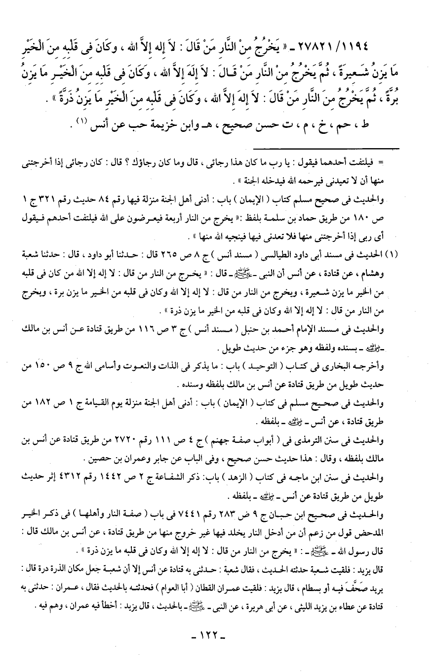 (¬1) الحديث في مسند أَبى داود الطيالسى (مسند أنس) جـ 8 ص 265 قال: حدثنا أبو داود، قال: حدثنا شعبة وهشام، عن قتادة، عن أنس أن النبى -صلى اللَّه عليه وسلم- قال: "يخرج من النار من قال: لا إله إلا اللَّه من كان في قلبه من الخير ما يزن شعيرة، ويخرج من النار من قال: لا إله إلا اللَّه وكان في قلبه من الخير ما يزن برة، ويخرج من النار من قال: لا إله إلا اللَّه وكان في قلبه من الخير ما يزن ذرة".