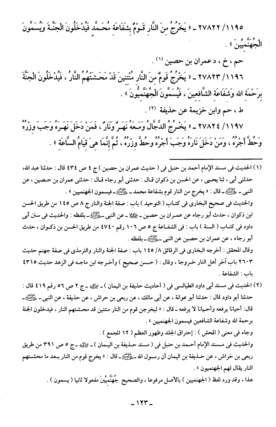 (¬2) الحديث في مسند أَبى داود الطيالسى في (أحاديث حذيفة بن اليمان) -رضي اللَّه عنه- جـ 2 ص 56 رقم 419 قال: حدثنا أبو داود قال: حدثنا أبو عوانة، عن أَبى مالك، عن ربعى بن حراش، عن حذيفة، عن النبى -صلى اللَّه عليه وسلم- قال: أحيانا يرفعه وأحيانا لا يرفعه - قال: "ليخرجن قوم من النار منتنين قد محشتهم النار، فيدخلون الجنة برحمة اللَّه وشفاعة الشافعين فيسمون الجهنميين".