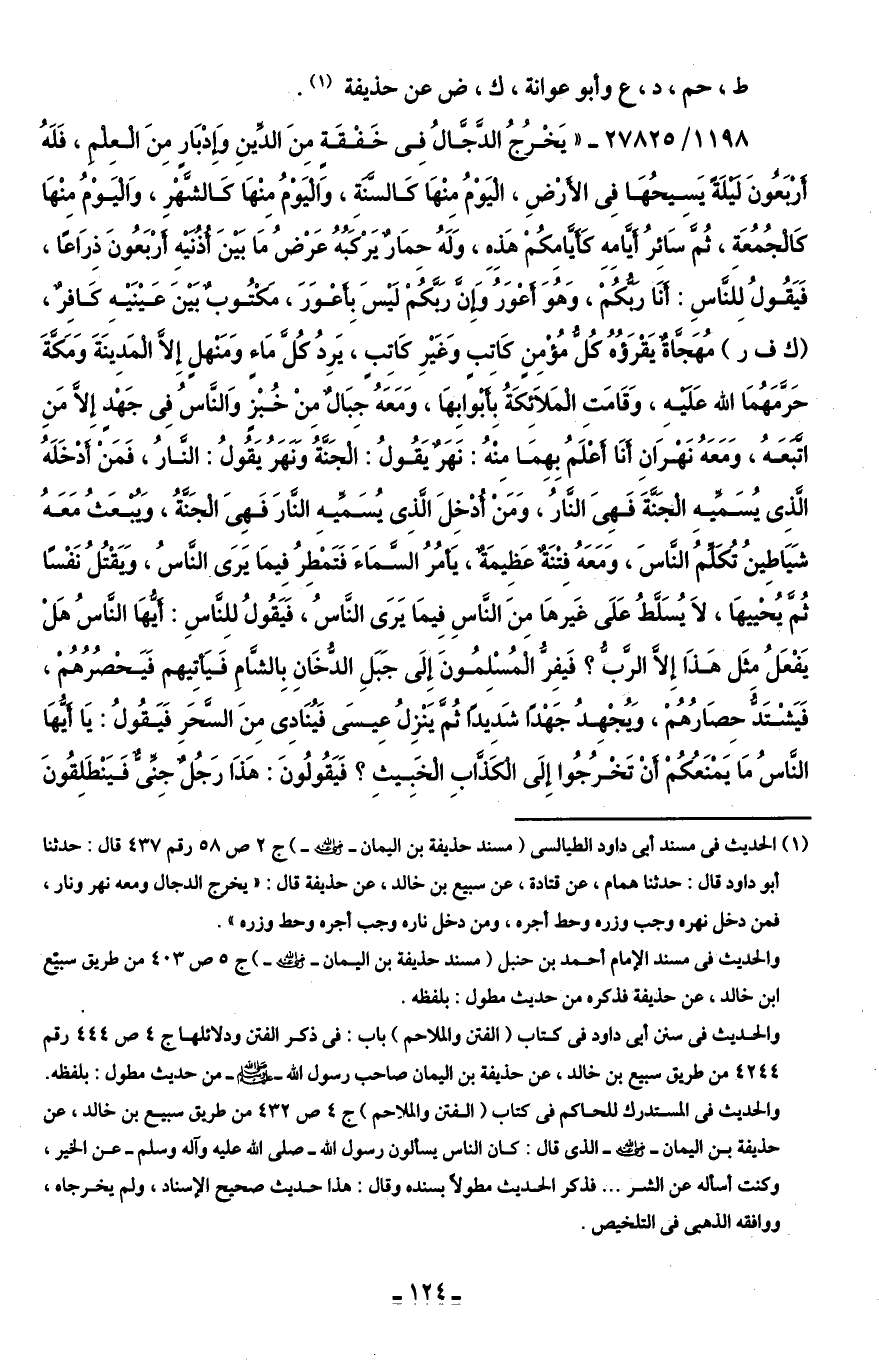 1198/ 27825 - "يَخْرُجُ الدَّجَّالُ فِى خَفْقَة مِنَ الدِّينِ وَإِدْبَار مِنَ الْعِلْمِ، فَلَهُ أَرْبَعُونَ لَيْلَةً يَسِيحُهَا فِى الأَرْضِ، اليَوْمُ مِنْهَا كَالسَّنَةِ، وَاليَوْمُ مِنْهَا كَالشَّهرِ، وَالْيَوْمُ منْهَا كَالْجُمُعَةِ، ثُمَّ سَائِرُ أيَّامِهِ كأيَّامِكُمْ هَذِهِ، وَلَهُ حِمَارٌ يَرْكَبُهُ عَرْضُ مَا بينَ أذُنيهِ أَرْبَعُونَ ذِرَاعًا، فَيَقُولُ لِلنَّاسِ: أنَا رَبُّكُمْ، وَهُوَ أَعْوَرُ وَإِنَّ ربَّكُمْ لَيْسَ بِأعْوَرَ، مكْتُوبٌ بَيْنَ عَيْنَيْهِ كَافِرٌ، (ك ف ر) مُهَجَّأةٌ يَقْرَؤُهُ كُل مُؤمِنِ كَاتِبٍ وَغَيْرِ كَاتِبٍ، يَرِدُ كُلَّ مَاءٍ وَمَنهلٍ إِلَّا الْمَدِينَةَ وَمَكَّةَ حَرَّمَهُمَا اللَّه عَليْهِ، وَقَامَتِ الْمَلَائِكَةُ بأَبْوابِهَا، وَمَعَهُ جِبَالٌ مِنْ خُبْزِ وَالنَّاسُ فِى جَهْدٍ إِلَّا مَنِ اتَّبَعَهُ، وَمَعَهُ نَهْرَانِ أَنَا أَعْلَمُ بِهِمَا مِنهُ: نَهَرٌ يَقُولُ: الجَنَّةُ ونَهَرٌ يَقُولُ: النَّارُ، فَمَنْ أَدْخَلَهُ الَّذِى يُسَمِّيه الجنَّةَ فَهِى النَّارُ، وَمَن أُدْخِلَ الَّذى يُسَمِّيهِ النَّارَ فَهِى الجَنُّةُ، وَيُبْعَثُ مَعَهُ شَيَاطِينُ تُكَلِّمُ النَّاسِ، وَمَعَهُ فِتنَةٌ عَظِيمَةٌ، يَأمُرُ السَّمَاءَ فَتَمْطِرُ فِيمَا يَرَى النَّاسُ، وَيَقْتُلُ نَفْسًا ثُمَّ يُحْييهَا، لَا يُسَلَّطُ عَلَى غَيرهَا مِنَ النَّاسِ فِيمَا يَرَى النَّاسُ، فَيَقُولُ للِنَّاسِ: أَيُّهَا النَّاسُ هَلْ يَفْعَلُ مثَل هَذَا إِلَّا الرَّبُّ؟ فَيفِرُّ الْمُسْلِمُونَ إِلَى جَبَلِ الدُّخَانِ بِالشَّام فَيَأتِيهم فَيَحْصُرُهُمْ، فَيَشْتَدُّ حِصَارُهُمْ، وَيُجْهِدُ جَهْدًا شَدِيدًا ثُمَّ يَنْزِلُ عِيسَى فَيُنَادِى مِنَ السَّحَرِ فَيَقُولُ: يَا أَيُّهَا النَّاسُ مَا يَمْنَعُكُمْ أَنْ تَخرُجُوا إِلَى الْكَذَّابِ الْخَبِيثَ؟ فَيَقُولُونَ: هَذَا رَجُلٌ جِنِّىٌّ فَيَنْطَلِقُونَ