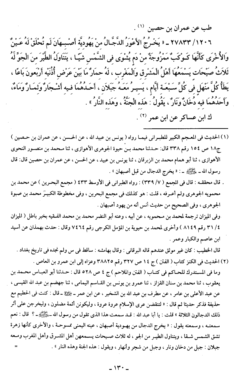 (¬1) الحديث في المعجم الكبير للطبرانى فيما رواه (يونس بن عبيد اللَّه، عن الحسن، عن عمران بن حصين) جـ 18 ص 154 رقم 338 قال: حدثنا محمد بن حيوة الجوهرى الأهوازى، ثنا محمد بن منصور النحوى الأهوازى، ثنا أبو همام محمد بن الزبرقان، ثنا يونس بن عبيد، عن الحسن، عن عمران بن حصين قال: قال رسول اللَّه -صلى اللَّه عليه وسلم-: "يخرج الدجال من قبل أصبهان".