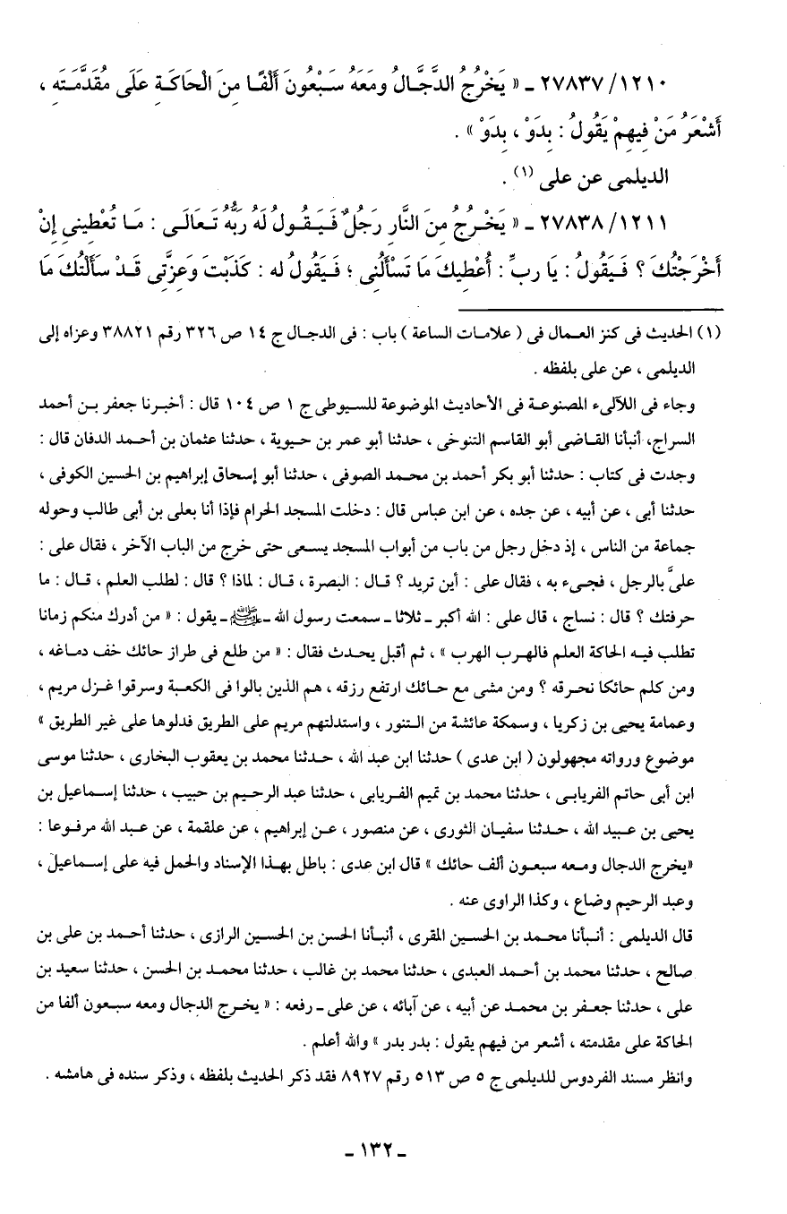1210/ 27837 - "يَخْرُجُ الدَّجَّالُ ومَعَهُ سَبْعُونَ أَلْفًا مِنَ الْحَاكَةِ عَلَى مُقَدَّمَتَهِ، أَشْعَرُ مَنْ فِيهِمْ يَقُولُ: بِدَوْ، بِدَوْ".