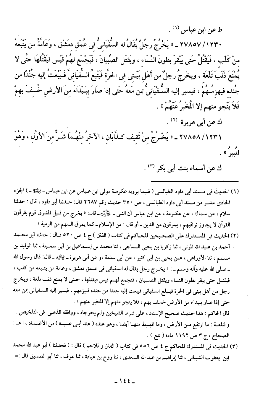 1230/ 27857 - "يَخْرُجُ رجُلٌ يُقَالُ له السُّفْيَانِىُّ فِى عُمْقِ دِمَشْق، وَعَامَّةُ من يَتْبَعهُ مِنْ كَلْبٍ، فَيَقْتُلُ حَتى يَبْقرَ بطونَ النِّسَاءِ، ويَقتَل الصِّبيانَ، فَيَجْمَع لهُمْ قَيْس فيَقْتُلهَا حَتَّى لا يُمْنَعَ ذَنَبَ تَلْعَةٍ، ويخْرجُ رجلٌ من أَهْلِ بَيْتِى فِى الحرَّةِ فَيَتْبعُ السُّفيَانِىَّ فَيَبْعَثُ إليه جُنْدًا من جُندِهِ فيهزِمُهُمْ، فيسير إليه السُّفْيَانِىُّ بمن مَعهُ حَتى إذا صَارَ بِبَيْدَاءَ مِنَ الأَرْضِ خُسِفَ بهِمْ فَلَا يَنْجو منهم إلا المُخْبرُ عَنْهُمْ".
