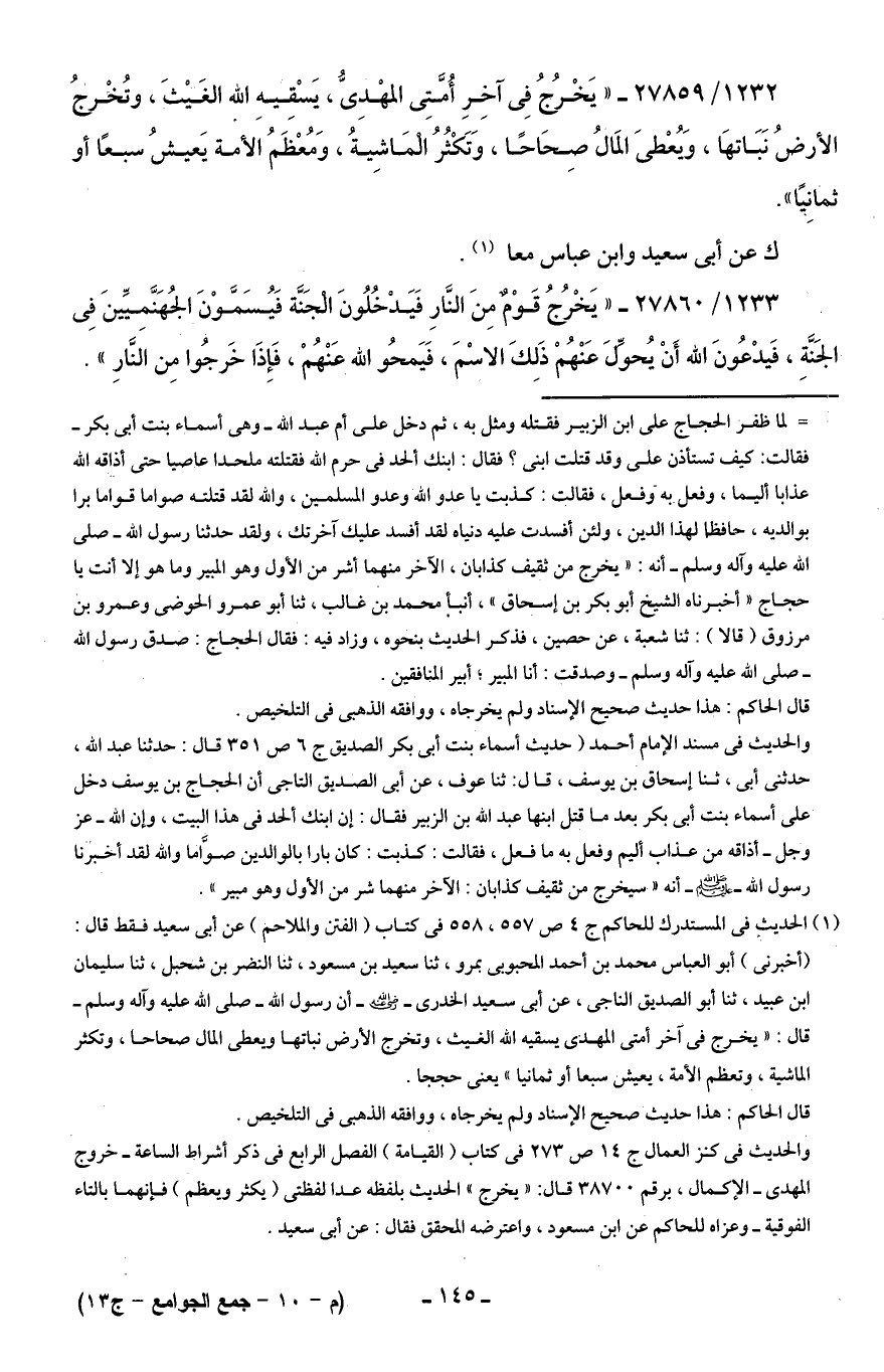 1232/ 27859 - "يَخْرجٌ فِى آخِرِ أُمَّتِى المهْدِىُّ، يَسْقِيهِ اللَّه الغَيْثَ، وتُخْرجُ الأرضُ نَبَاتهَا، وَيُعْطى المَالُ صِحَاحًا، وَتَكْثُرُ الْمَاشِيةُ، وَمُعْظَمُ الأمة يَعيشُ سبعًا أو ثمانِيًا".