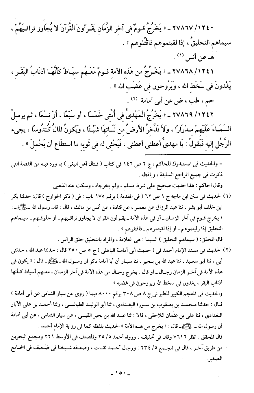 1240/ 27867 - "يَخْرُجُ قومٌ فِى آخِر الزَّمَانِ يَقْرَأونَ الْقُرآنَ لا يُجَاوز تراقيَهُمْ، سيماهم التحليقُ، إذا لقيتموهم فاقْتُلوهم".