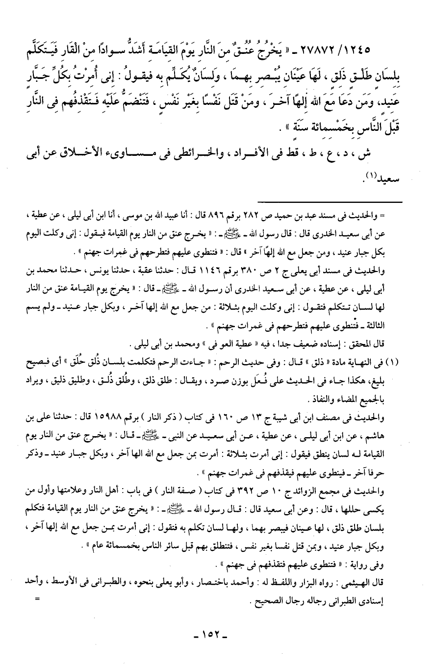1245/ 27872 - "يَخْرُجُ عُنُقٌ مِنَ النَّارِ يَوْمَ الْقِيَامَةِ أَشَدُّ سوادًا مِنْ الْقَارِ فَيَتَكَلَّم بِلِسَانٍ طَلقٍ ذَلِقٍ، لَهَا عَيْنَانِ يُبْصِر بِهمَا، وَلِسَانٌ يُكَلِّم بِه فيقولُ: إِنِّى أُمِرْتُ بِكُلِّ جَبَّارٍ عَنِيد، وَمَن دَعَا مَعَ اللَّه إِلهًا آخرَ، ومَنْ قَتَل نَفْسًا بِغَيْر نَفْسٍ، فَتَنْضَمُّ عَلَيْهِ فَتَقْذِفُهم فِى النَّارِ قَبْلَ النَّاسِ بِخَمْسِمِائة سَنَةٍ".