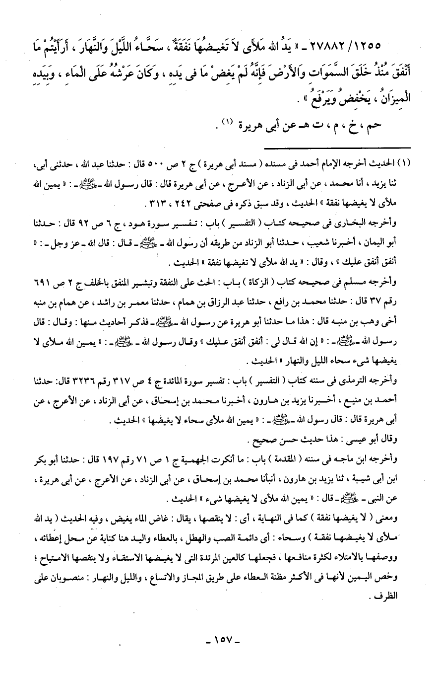 1255/ 27882 - "يَدُ اللَّه مَلأَى لَا تَغيضُهَا نَفَقَةٌ، سَحَّاءُ اللَّيْلَ وَالنَّهَارَ، أَرَأيْتُمْ مَا أَنْفَقَ مُنْذُ خَلَقَ السَّمَوَاتِ وَالأَرْضَ فَإِنَّهُ لَمْ يَغِضْ مَا في يَدِهِ، وَكَانَ عَرْشُهُ عَلَى الْمَاءِ، وَبِيَدِهِ الْمِيزَانُ، يَخْفِضُ وَيَرْفَعُ".