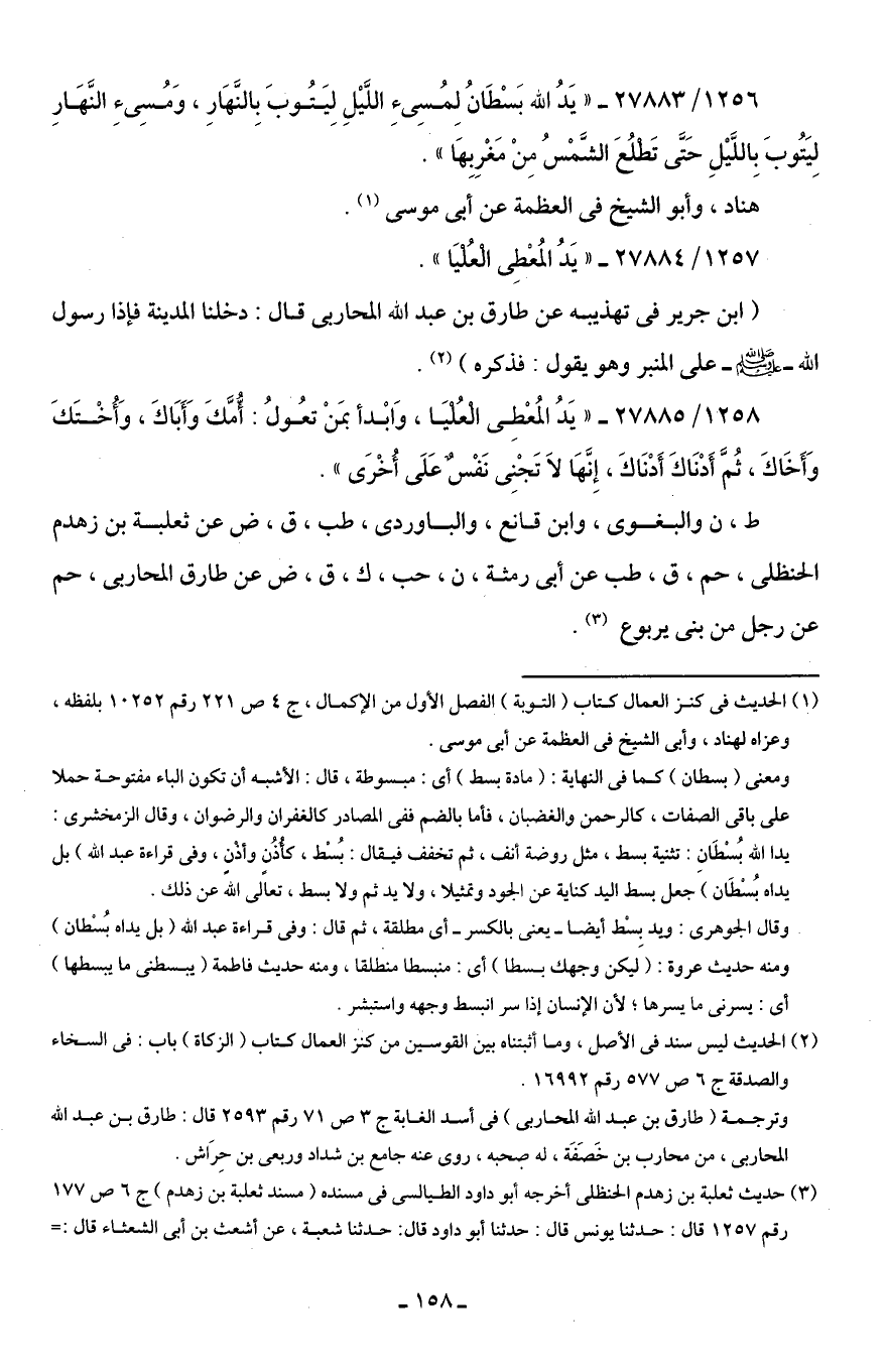 1256/ 27883 - "يَدُ اللَّه بَسْطَانُ لِمُسِئِ اللَّيْلِ لِيَتُوبَ بِالنَّهَارِ، وَمُسِئِ النَّهَارِ لِيَتُوبَ بِاللَّيْلِ حَتَّى تَطلُعَ الشَّمْسُ مِنْ مَغْرِبِهَا".