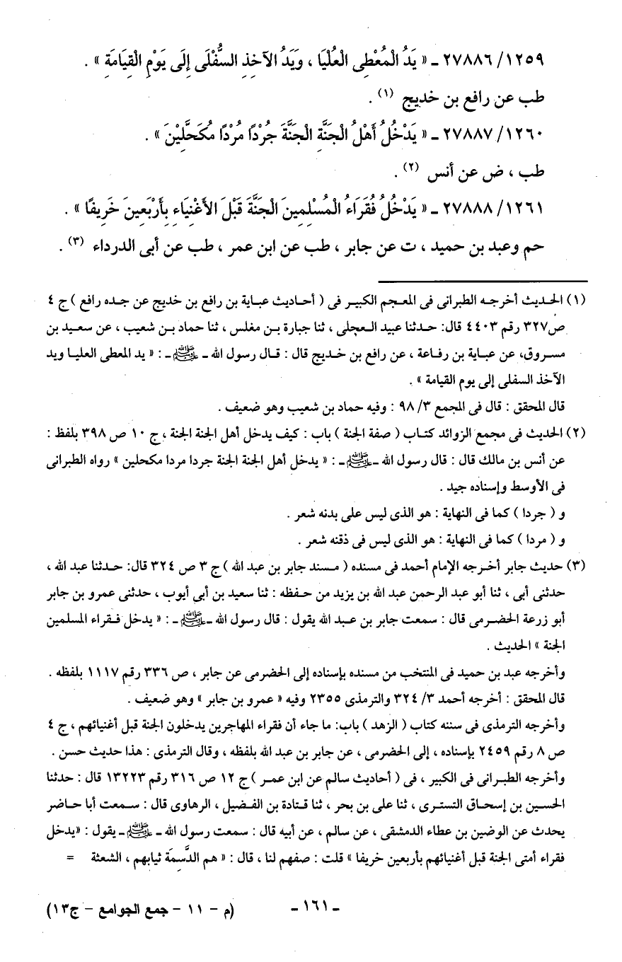 (¬3) حديث جابر أخرجه الإمام أحمد في مسنده (مسند جابر بن عبد اللَّه) جـ 3 ص 324 قال: حدثنا عبد اللَّه، حدثنى أَبى، ثنا أبو عبد الرحمن عبد اللَّه بن يزيد من حفظه: ثنا سعيد بن أَبى أبوب، حدثنى عمرو بن جابر أبو زرعة الحضرمى قال: سمعت جابر بن عبد اللَّه يقول: قال رسول اللَّه -صلى اللَّه عليه وسلم-: "يدخل فقراء المسلمين الجنة" الحديث.