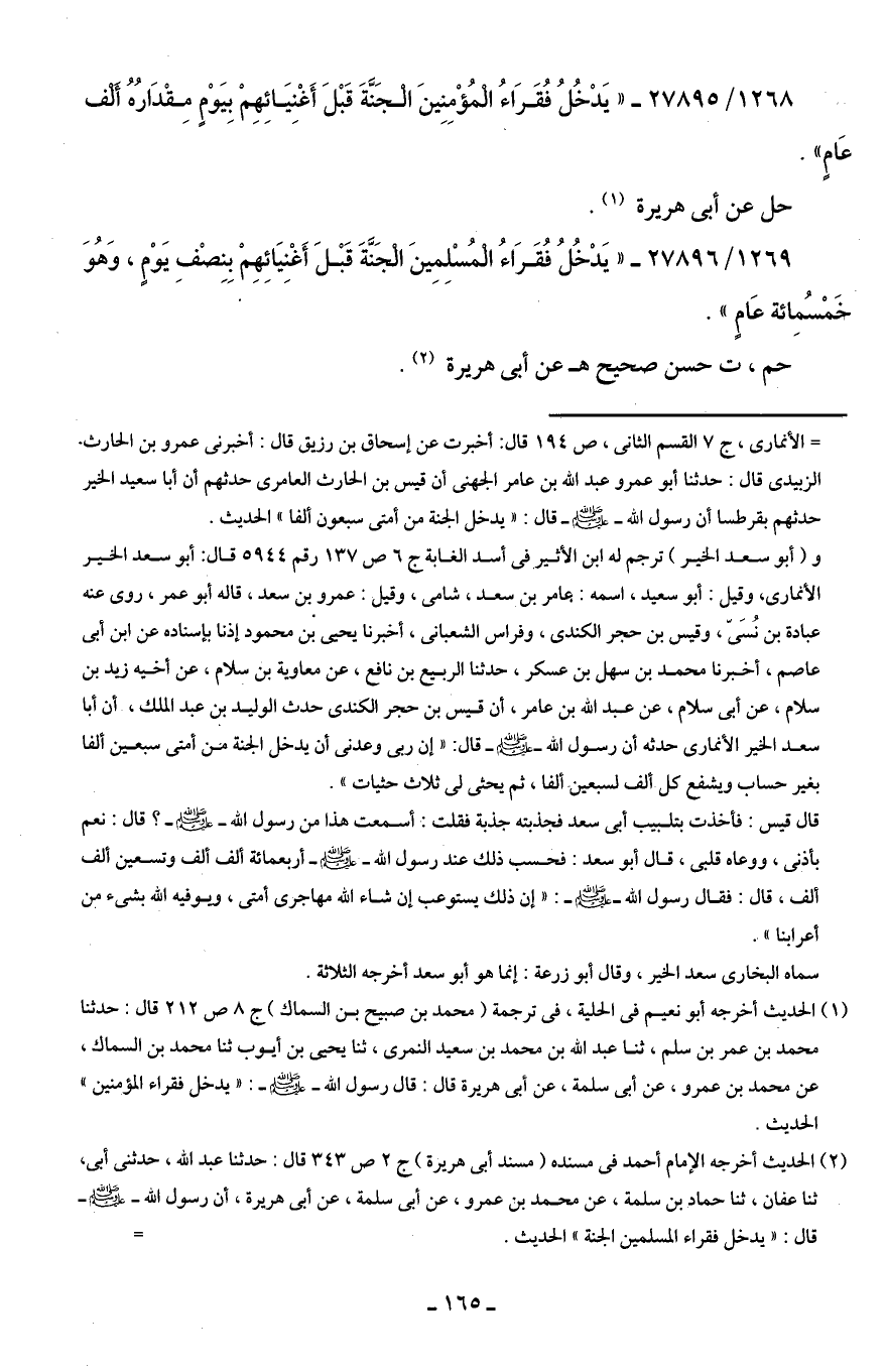 1269/ 27896 - "يَدْخُلُ فُقَرَاءُ الْمُسْلِمِينَ الْجَنَّةَ قَبْلَ أَغْنِيَائِهِمْ بِنِصْفِ يَوْمٍ، وَهُوَ خَمْسُمِائة عَامٍ".