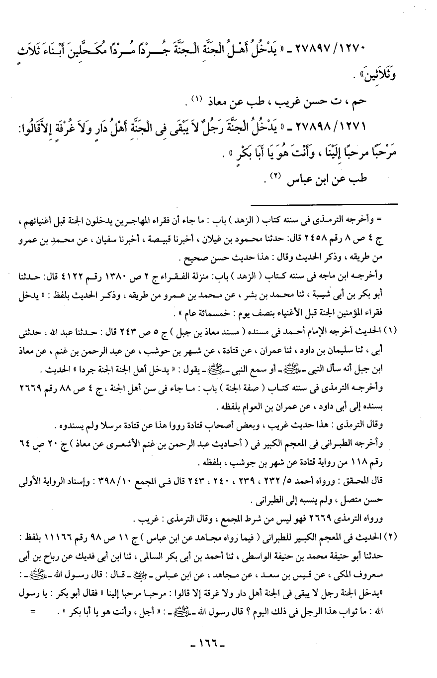 1271/ 27898 - "يَدْخُلُ الْجَنَّةَ رَجُلٌ لَا يَبْقَى فِى الْجَنَّةِ أَهْلُ دَارٍ وَلَا غُرْفَة إِلَّا قَالُوا: مَرْحَبًا مَرْحبًا إِلَيْنَا، وَأَنْتَ هُوَ يَا أَبَا بَكْرٍ".