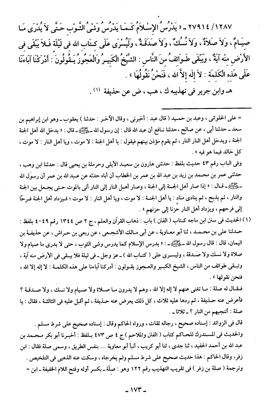1287/ 27914 - "يَدْرُسُ الإِسْلَامُ كَمَا يَدْرُسُ وَشْىُ الثَّوْبِ حَتَّى لَا يُدْرَى مَا صِيَامٌ، وَلَا صَلَاةٌ، وَلَا نُسُكٌ، وَلَا صَدَقَةٌ، وَلَيُسْرَى عَلَى كتَاب اللَّه فِى لَيْلَةٍ فَلَا يَبْقَى فِى الأَرْضِ مِنْه آيَةٌ، وَيَبْقَى طَوَائِفُ مِنَ النَّاسِ: الشَّيْخُ الْكَبِيرُ وَالْعَجُوَزُ يَقُولُونَ: أَدْرَكْنَا آبَاءَنَا عَلَى هَذِهِ الْكَلِمَةِ: لَا إِلَه إِلَّا اللَّه، فَنَحْنُ نَقُولُهَا".