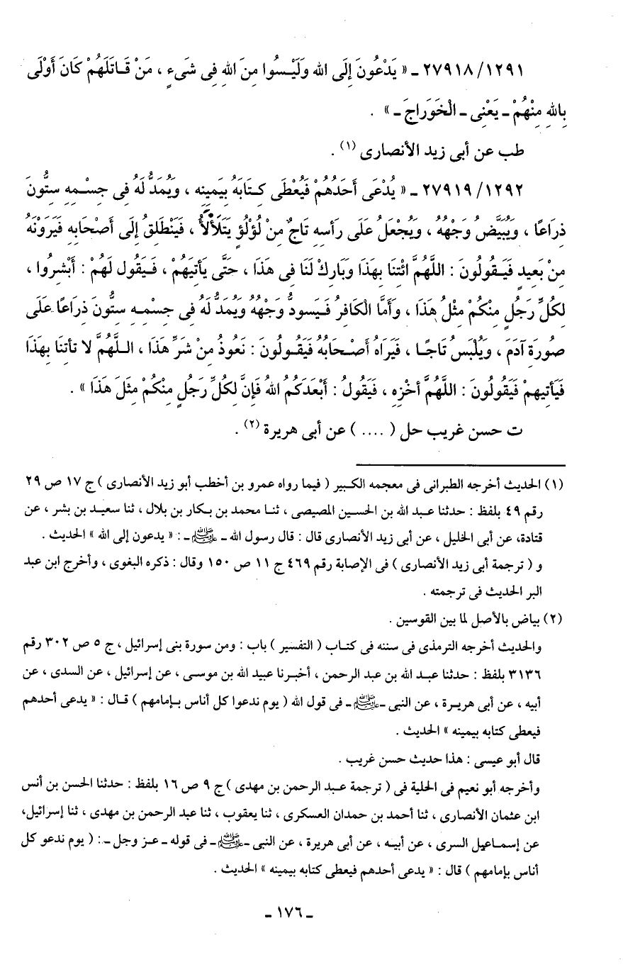 1292/ 27919 - "يُدْعَى أَحَدُهُمْ فَيُعْطَى كِتَابَهُ بِيَميِنه، ويُمَدُّ لَهُ فِى جِسْمِهِ سِتُّونَ ذِرَاعًا، ويُبَيَّضُ وَجْهُهُ، ويُجْعَلُ عَلَى رَأسِهِ تَاجٌ مِنْ لُؤْلُؤٍ يَتَلأَلأ، فَيَنْطَلِقُ إِلَى أَصْحَابِهِ فَيَرَوْنَهُ مِنْ بَعِيدٍ فَيَقُولُونَ: اللَّهُمَّ ائْتِنَا بِهَذَا وَبَارِكْ لَنَا فِى هَذَا، حَتَّى يَأتِيَهُمْ، فَيَقُول لَهُمْ: أَبْشِرُوا، لِكُلِّ رَجُلٍ مِنْكُمْ مِثْلُ هَذَا، وَأَمَّا الْكَافِرُ فَيَسودُّ وَجْهُهُ وَيُمَدُّ لَهُ فِى جِسْمِهِ سِتُّونَ ذِرَاعًا عَلَى صُورَةِ آدَمَ، وَيُلْبَسُ تَاجًا، فَيَرَاهُ أَصْحَابُهُ فَيَقُولُونَ: نَعُوذُ مِن شَرِّ هَذَا، اللَّهُمَّ لا تأتِنَا بِهَذَا فَيَأتِيهمْ فَيَقُولُونَ: اللَّهُمَّ أخْزِهِ، فَيَقُولُ: أَبْعَدَكُمُ اللَّهُ فَإِنَّ لِكُلِّ رَجُلٍ مِنْكُمْ مِثَلَ هَذَا".