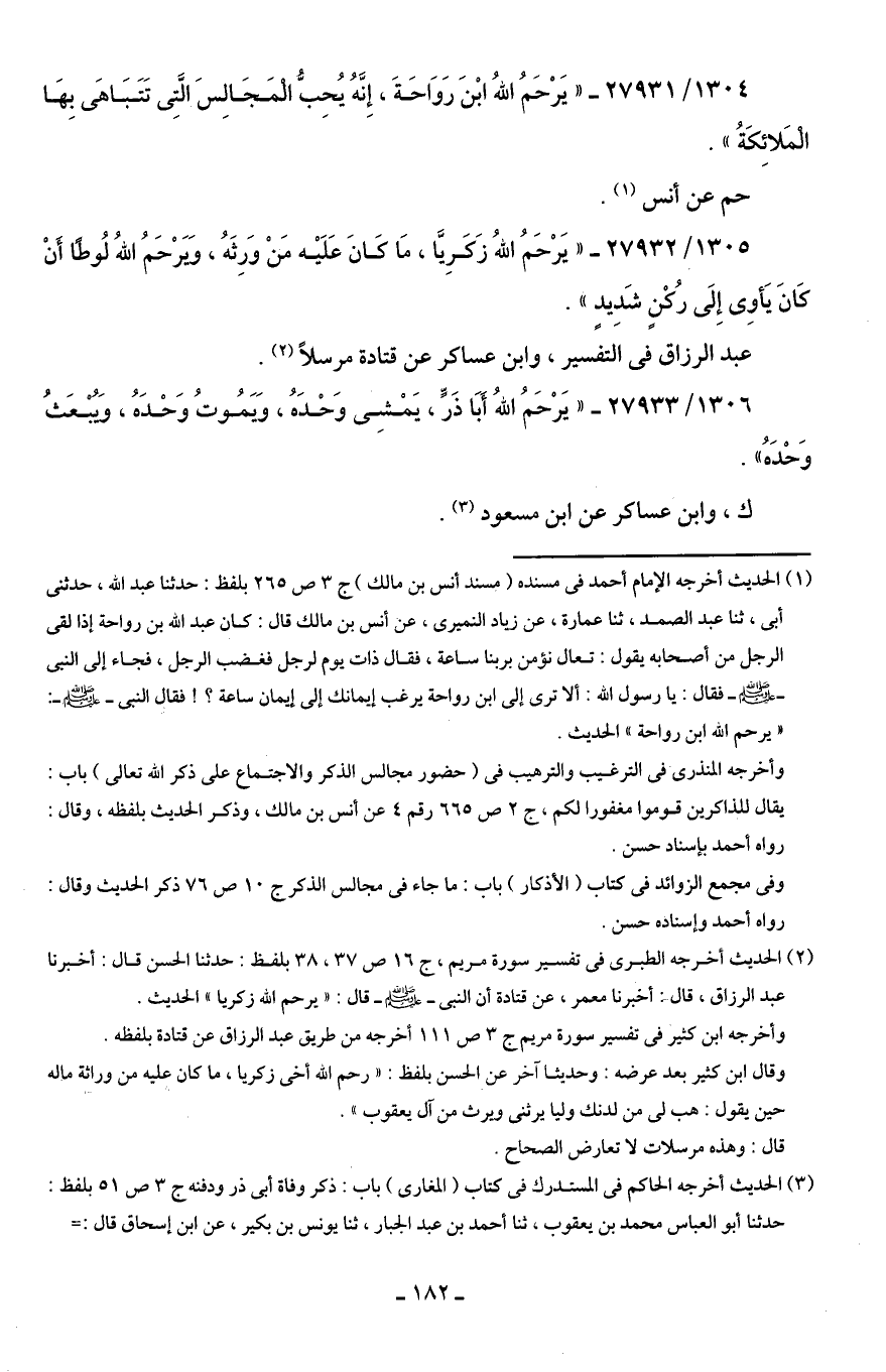 1304/ 27931 - "يَرْحَمُ اللَّهُ ابْنَ رَوَاحَةَ، إِنَّهُ يُحِبُّ الْمَجَالِسَ الَّتِى تَتَبَاهَى بِهَا الْمَلائكَةُ".