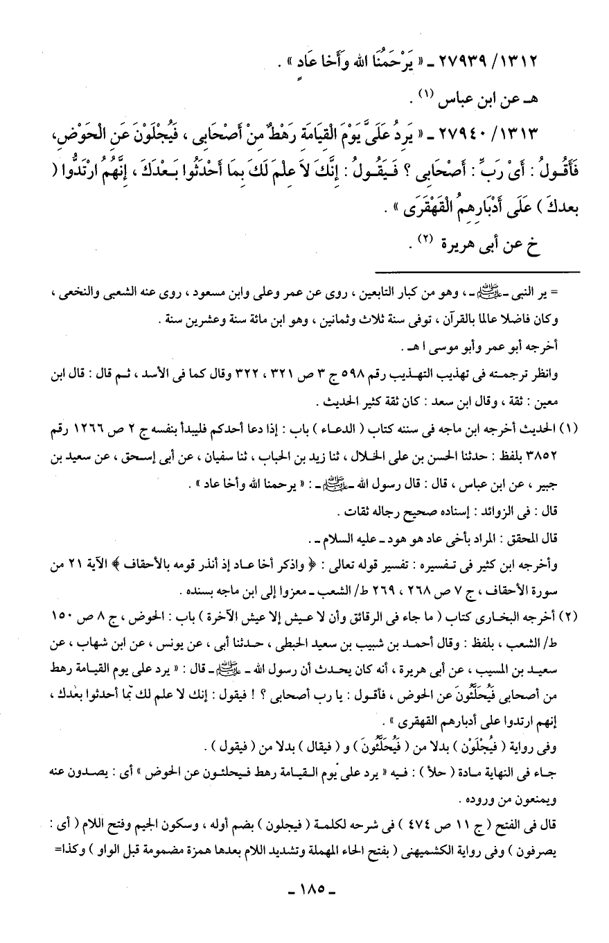 1313/ 27940 - "يَرِدُ عَلَىَّ يَوْمَ الْقِيَامَةِ رَهْطٌ مِنْ أَصْحَابِى، فَيُجْلَوْنَ عَنِ الْحَوْضِ، فَأَقُولُ: أَىْ رَبِّ: أَصْحَابِى؟ فَيَقُولُ: إِنَّكَ لَا عِلْمَ لَكَ بِمَا أَحْدَثُوا بَعْدَكَ، إِنَّهُمُ ارْتَدُّوا (بعدكَ) عَلَى أَدْبَارِهِمُ الْقَهْقَرَى".
