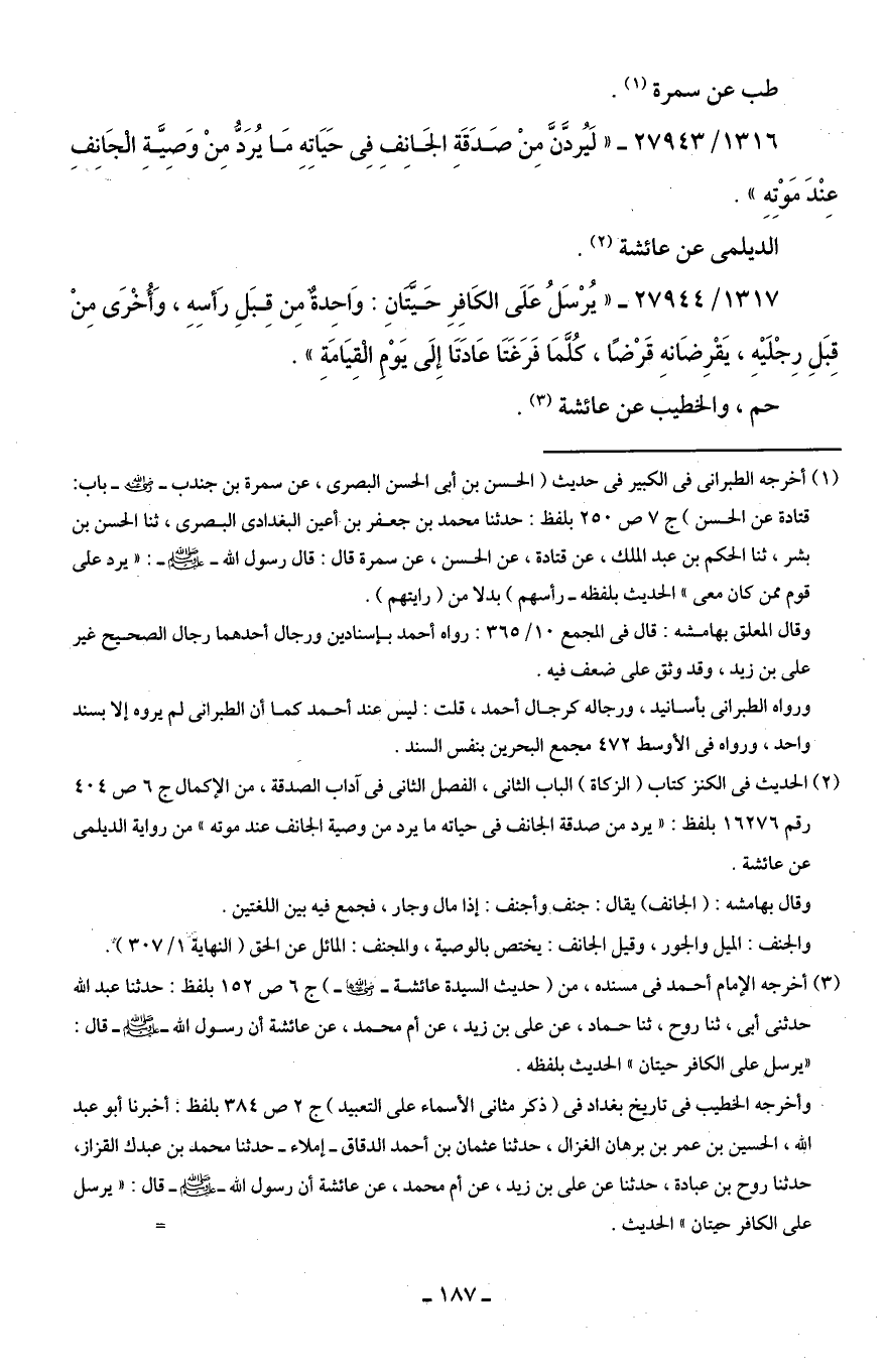 1317/ 27944 - "يُرْسَلُ عَلَى الكَافِرِ حَيَّتَانِ: وَاحِدةٌ مِن قِبَلِ رَأسِهِ، وَأُخْرَى مِنْ قِبَلِ رِجْلَيْهِ، يَقْرِضَانهِ قَرْضًا، كُلَّمَا فَرَغَتَا عَادَتَا إِلَى يَوْمِ الْقِيَامَةِ".
