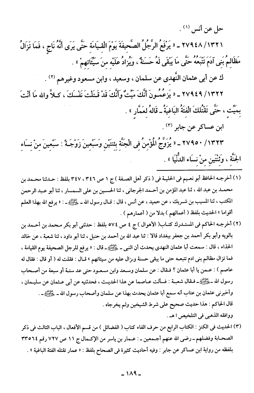 (¬2) أخرجه الحاكم في المستدرك كتاب (الأهوال) جـ 4 ص 574 بلفظ: حدثنى أبو بكر محمد بن أحمد بن بالويه وأَبو بكر أحمد بن جعفر ببغداد قالا: ثنا عبد اللَّه بن أحمد بن حنبل، ثنا أبو داود، ثنا شعبة، عن خالد الحذاء، قال: سمعت أبا عثمان النهدى يحدث أن النبى -صلى اللَّه عليه وسلم- قال: "يرفع للرجل الصحيفة يوم القيامة، فما تزال مظالم بنى ادم تتبعه حتى ما يبقى حسنة وتزال عليه من سيئاتهم" قال: فقلت له (أو قال: فقال له عاصم): عمن يا أبا عثمان؟ فقال: عن سلمان وسعد وابن مسعود حتى عد ستة أو سبعة من أصحاب رسول اللَّه -صلى اللَّه عليه وسلم- فقال شعبة: فسألت عاصما عن هذا الحديث، فحدثنيه عن أَبى عثمان عن سليمان، وأخبرنى عثمان بن عتاب أنه سمع أبا عثمان يحدث بهذا عن سلمان وأصحاب رسول اللَّه -صلى اللَّه عليه وسلم-.