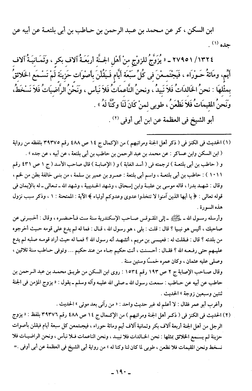 وقال صاحب الإصابة جـ 2 ص 193 رقم 1534: روى ابن السكن من طريق محمد بن عبد الرحمن بن حاطب عن أبيه عن حاطب: سمعت رسول اللَّه -صلى اللَّه عليه وآله وسلم- يقول: "يزوج المؤمن في الجنة ثنتين وسبعين زوجة" الحديث.