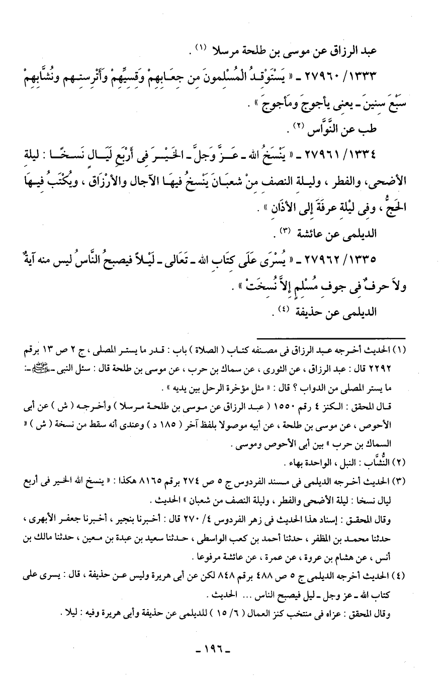 1334/ 27961 - "يَنْسَخُ اللَّه -عَزَّ وَجَلَّ- الخَيْرَ فِى أَرْبَعِ لَيَالٍ نَسخًا: ليلةِ الأضحى، والفطر، وليلةِ النصفِ مِنْ شعبَانَ يَنْسخُ فِيهَا الآجال والأرْزَاق، ويُكْتَبُ فِيهَا الحَجُّ، وفِى ليْلةِ عرفَةَ إِلى الأذَانِ".
