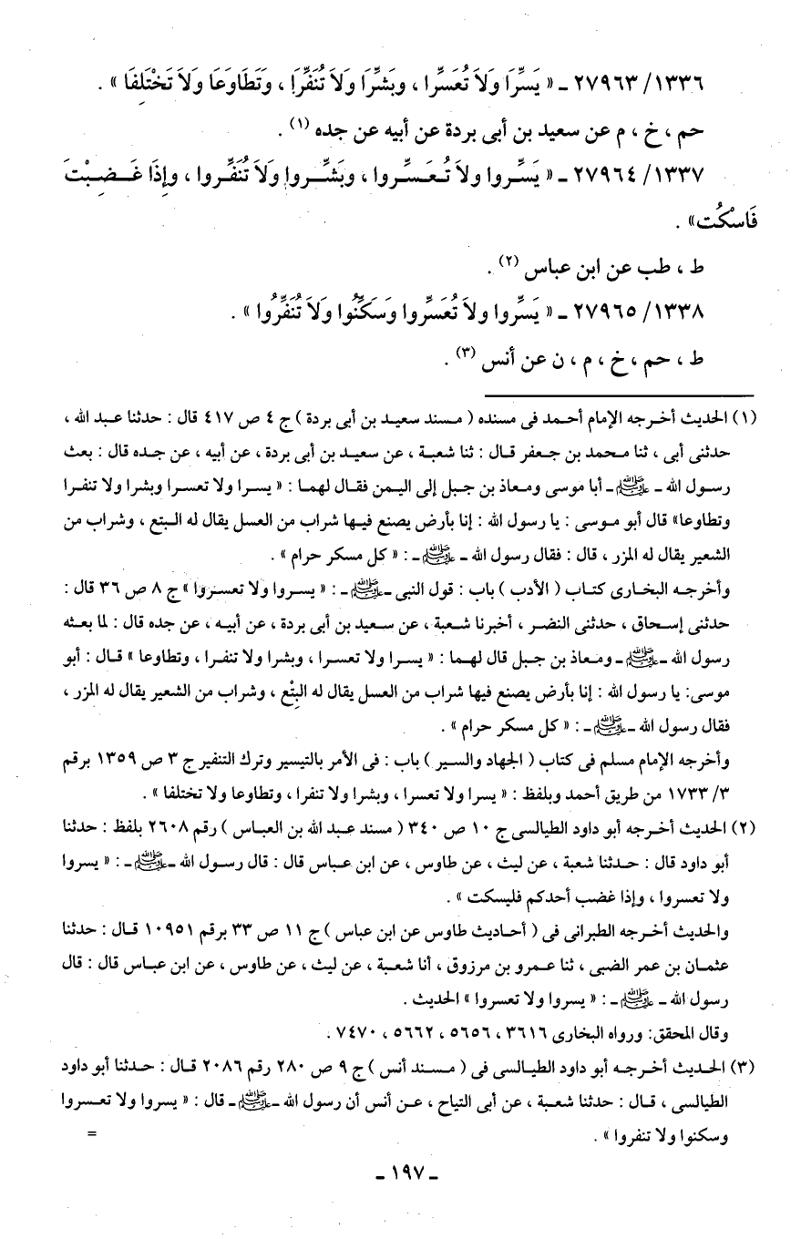1338/ 27965 - "يَسِّروا ولَا تُعَسِّروا وَسَكِّنُوا وَلَا تُنَفِّرُوا".